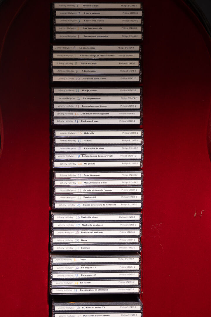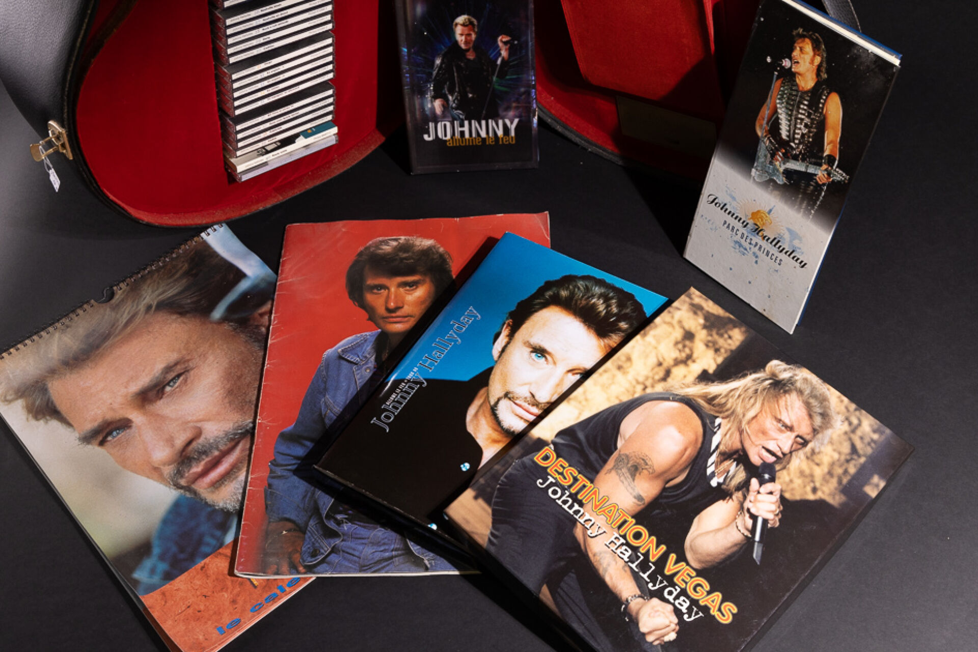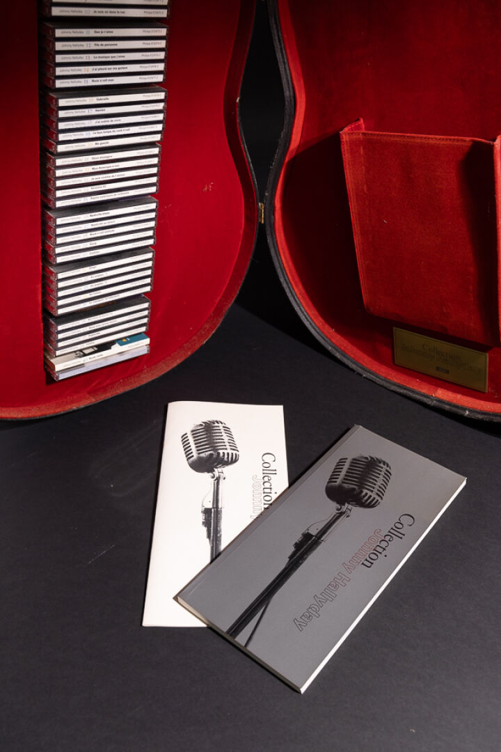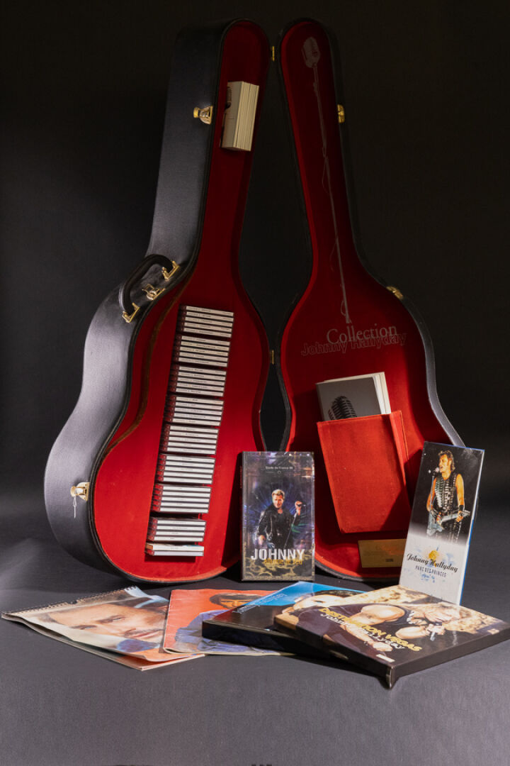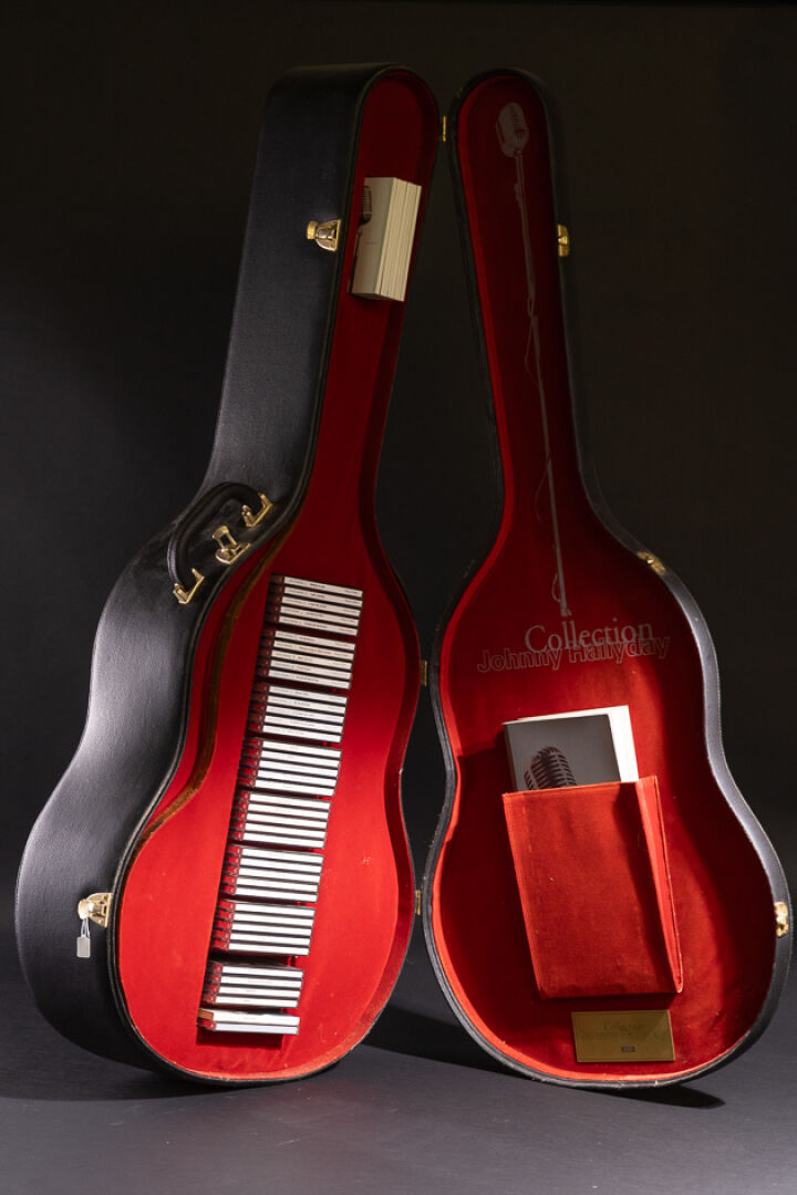 Univers JOHNNY HALLYDAY Étui de guitare porte-CD contenant 41 CD et des livrets. On joint : un calendrier et un grand magazine photos palais des sports 1976. Trois coffrets : "Destination VEGAS", "Stade de France 98" et "Parc des Princes" (non collationnés, vendus en l'état).