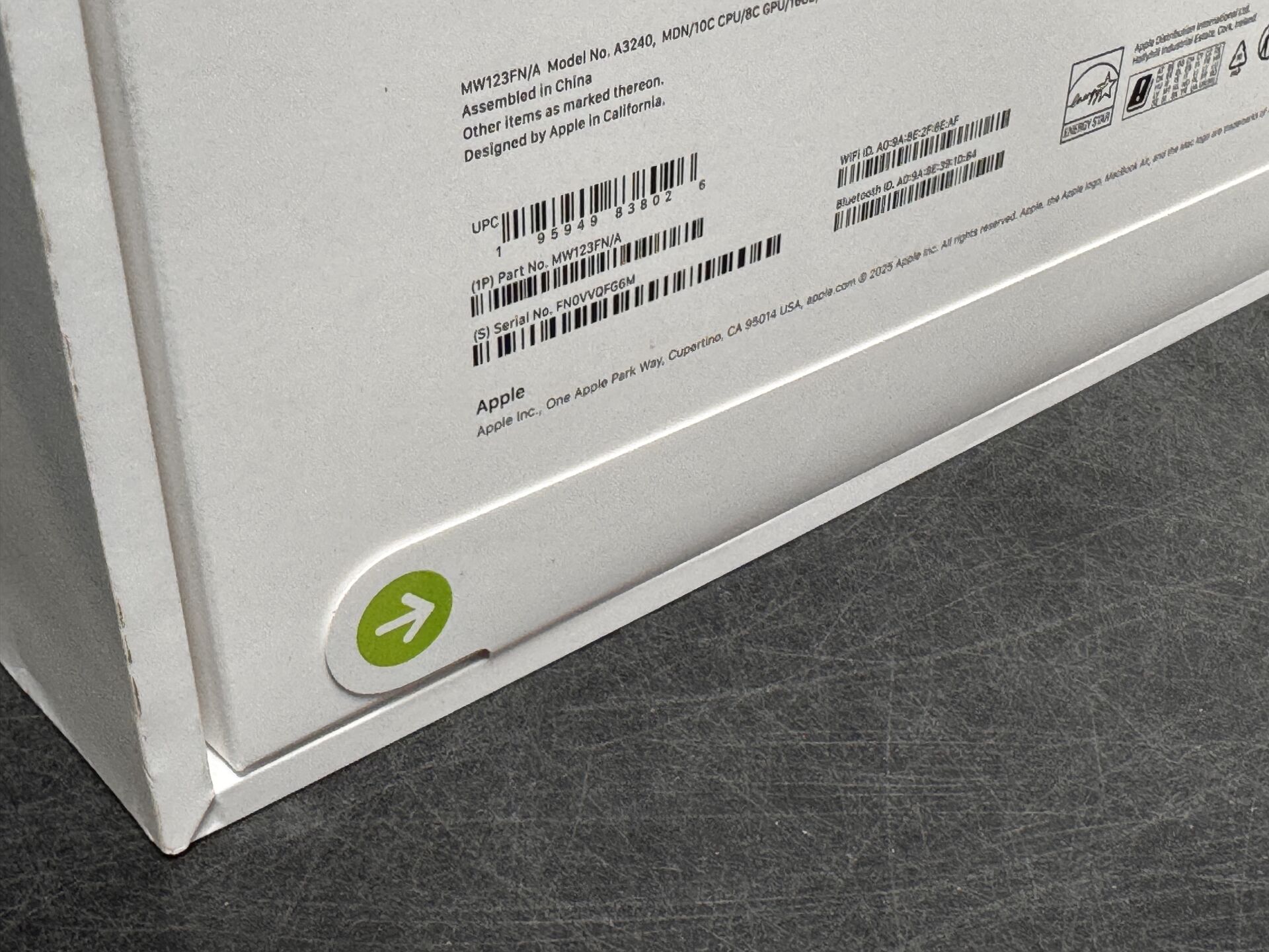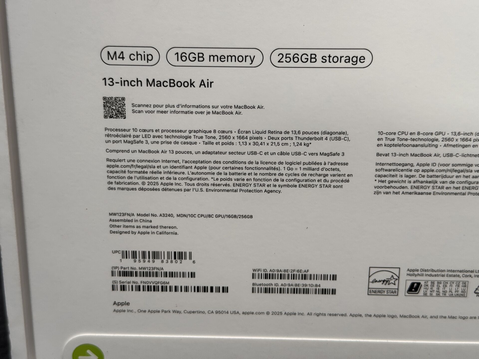 APPLE MACBOOK AIR 13" M4 16/256GB MW123FN/A SN FN0VVQFG6M 195949838026 (avec scellés) EXPEDITION POSSIBLE (ce lot chez vous en France métropolitaine pour 27,45€) Lot issu de colis non réclamés : état de fonctionnement non garanti.