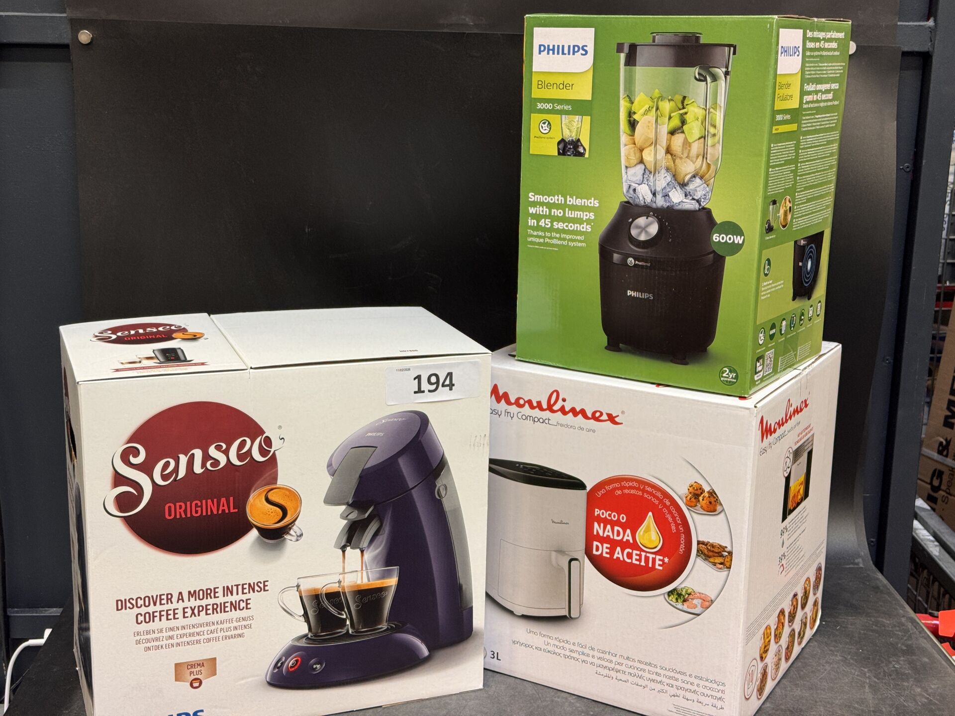 BLENDER PHILIPS 3000 SERIES + MACHINE A CAFE SENSEO ORIGINAL + AIRFRYER MOULINEX EASY FRY COMPACT (expédition sur devis) Lot issu de colis non réclamés : état de fonctionnement non garanti.