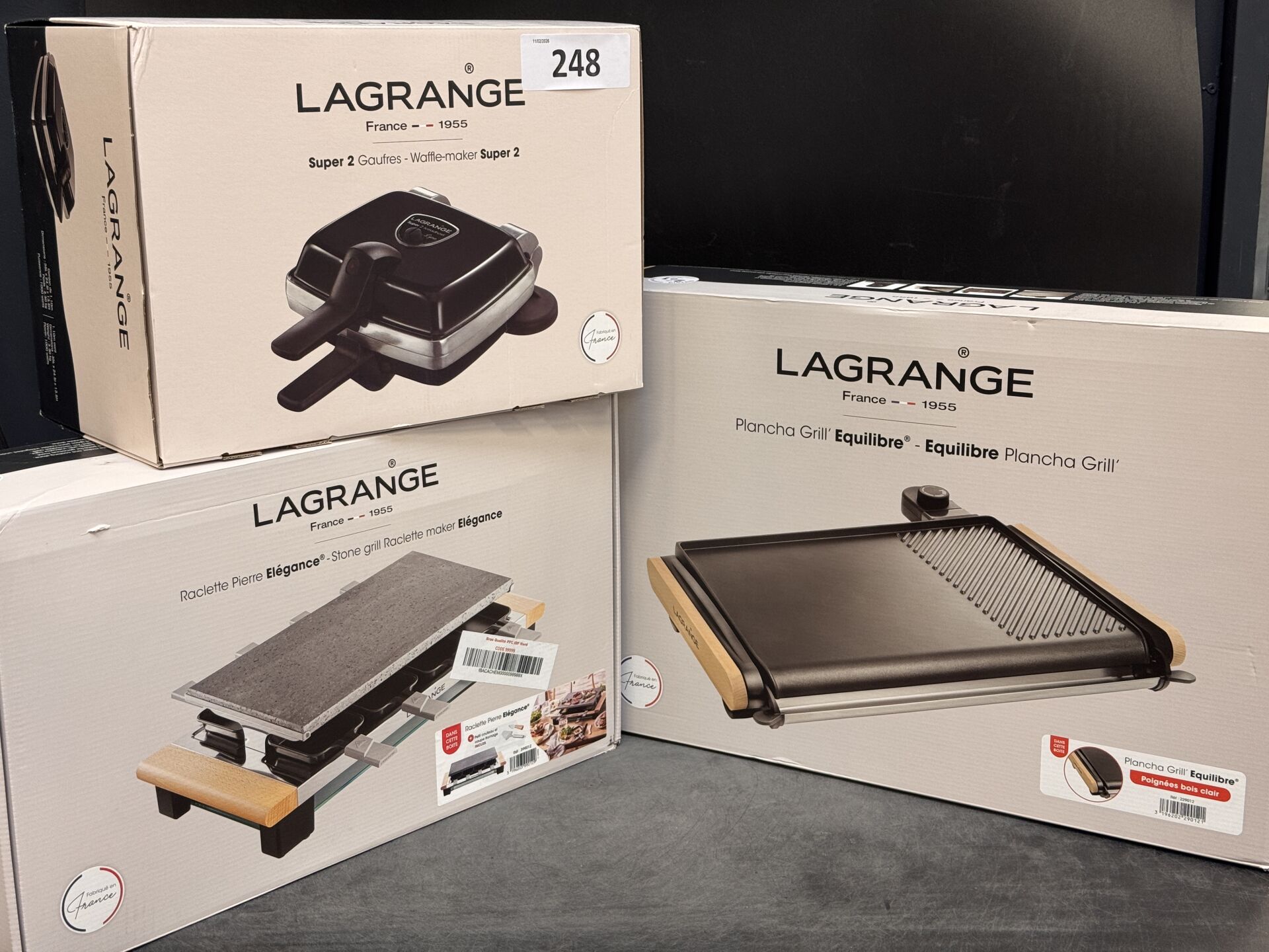 3 PIECES LAGRANGE : PLANCHA GRILL / SUPER 2 GAUFRES / RACLETTE PIERRE ELEGANCE (expédition sur devis) Lot issu de colis non réclamés : état de fonctionnement non garanti.