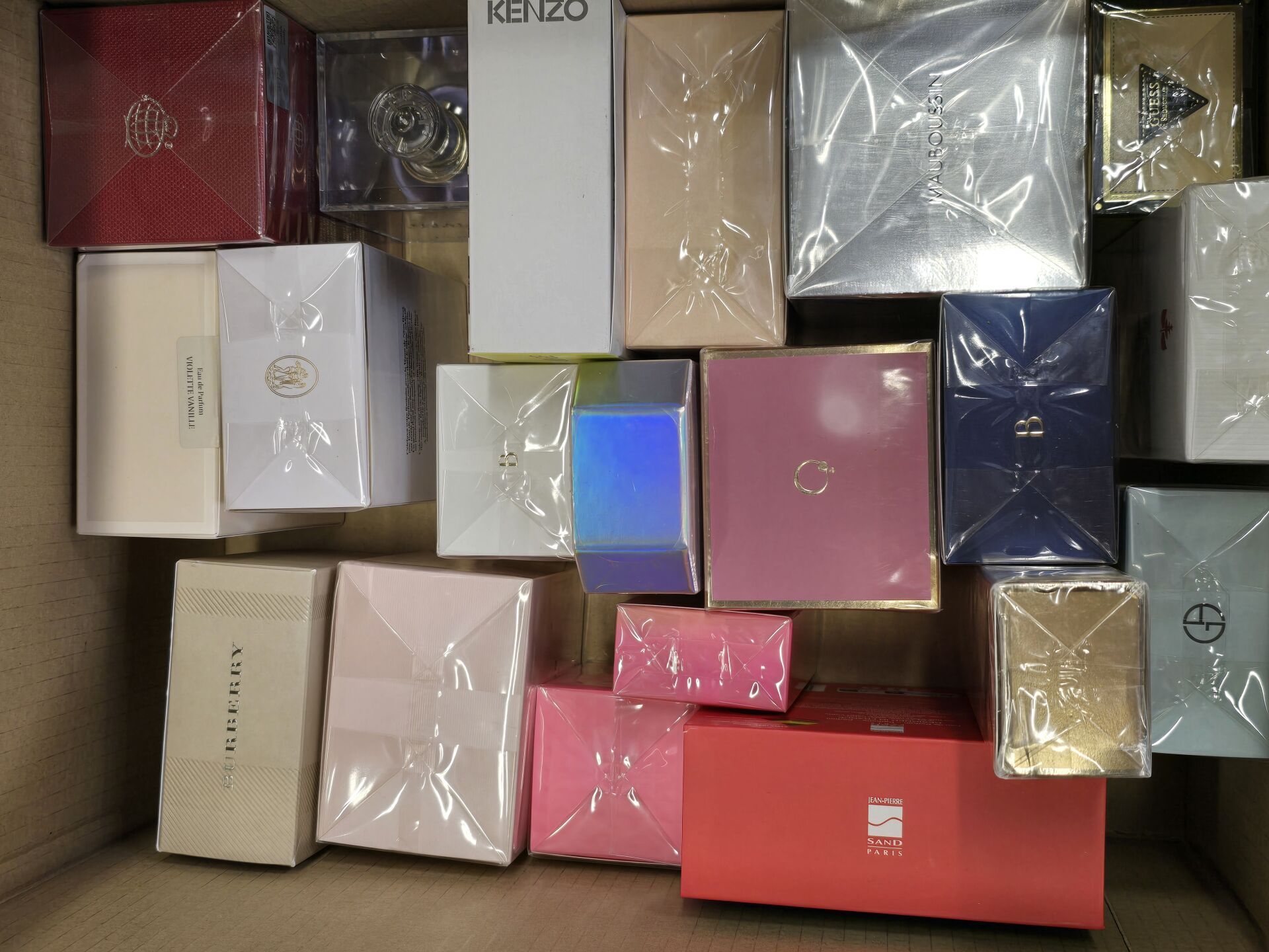 Ensemble d'environ 20 Parfums femme dont : MAUBOUSSIN, GUESS, ARMANI, ROCHAS, dans leur boite, différentes contenances.