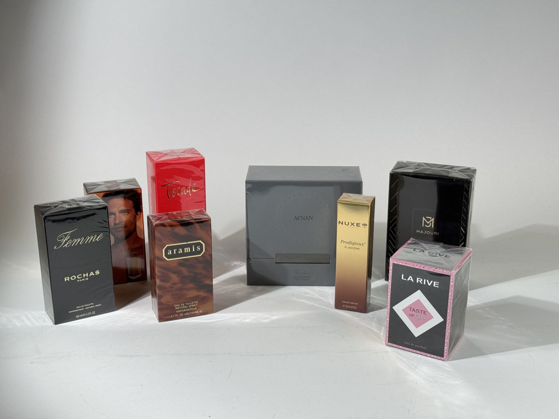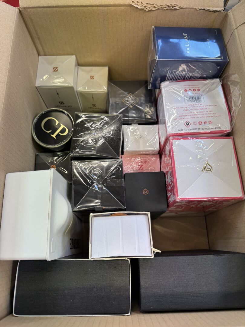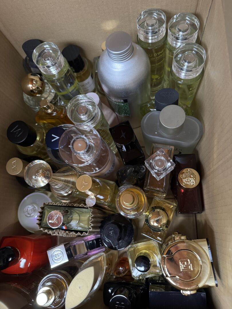 Ensemble d'environ 45 Parfums différents contenant dont : STAR PARFUM, OLFAZETA, TED LAPIDUS, ROCHAS… On joint un carton d'environ 35 parfums sans boite. En l'état