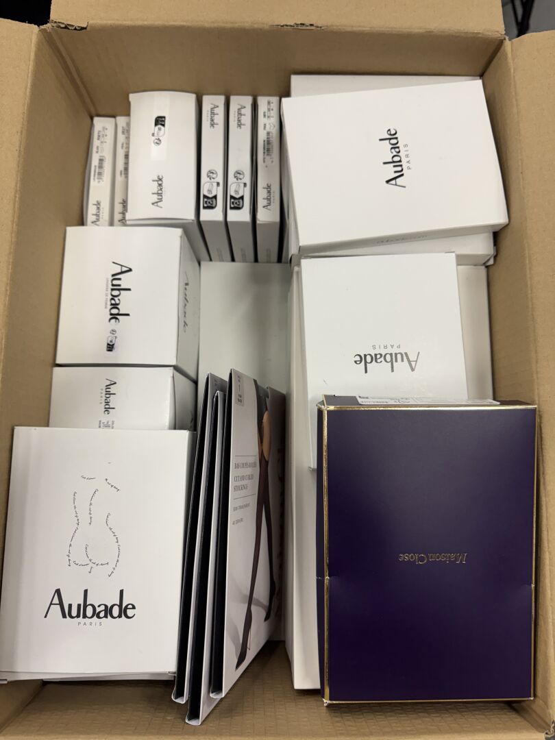 Fort ensemble d'environ 20 articles de lingerie : soutien gorge, culotte, maillot de bain, collants,… Diverses marques dont AUBADE, SAGO, MAISON CLOSE,… La majorité neufs.