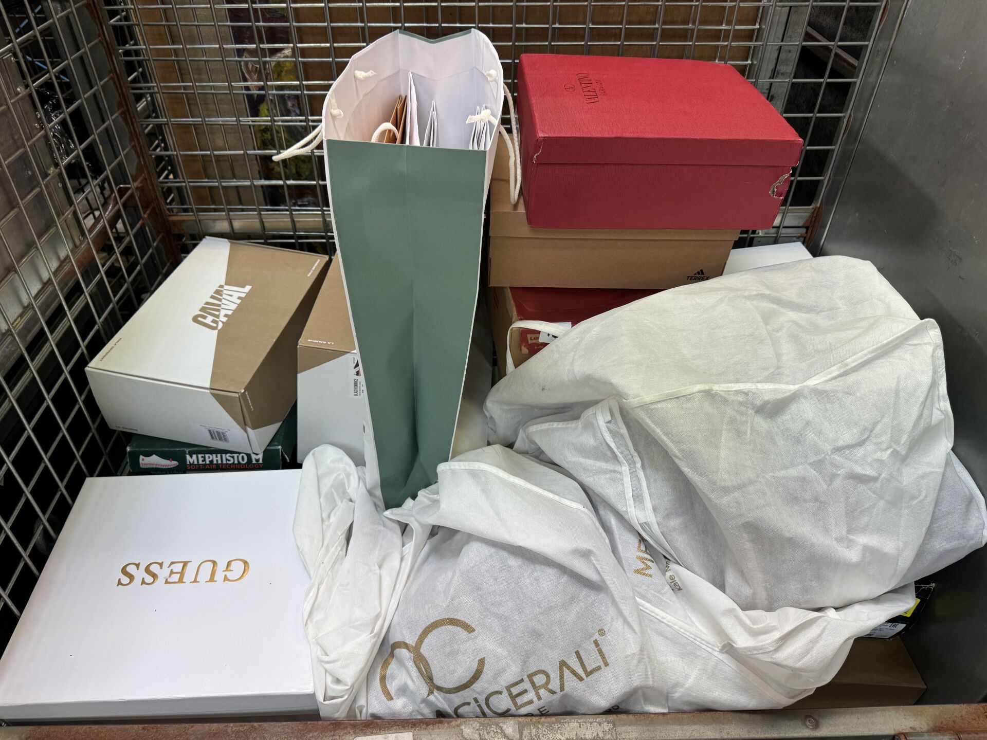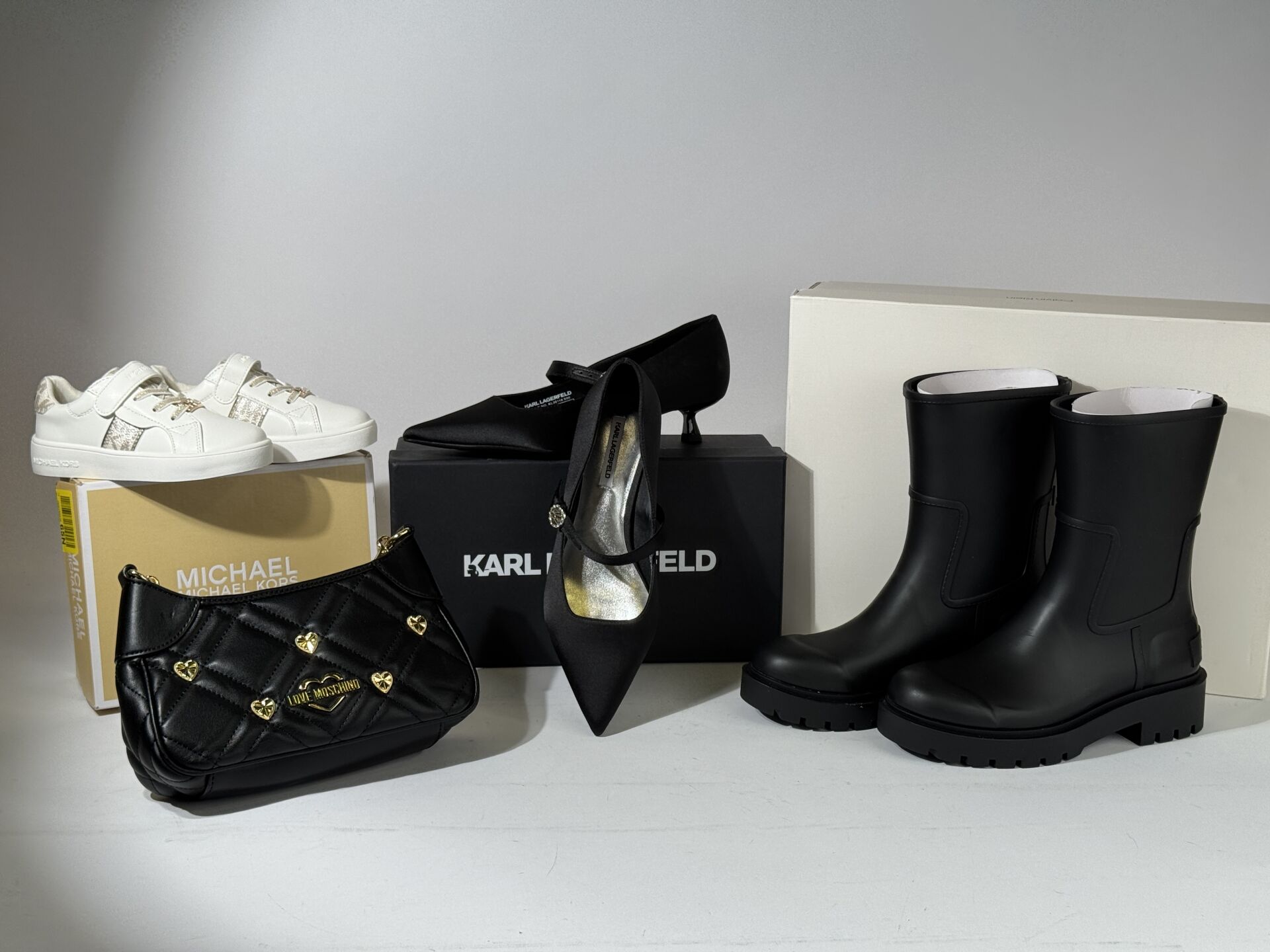 Fort ensemble d'environ 40 articles comprenant bottes, sacs, sneakers, ceintures,… Diverses marques dont CAVAL, TIMBERLAND, BOCAGE, KARL LAGERFELD, THE KOOPLES, GUESS, LANCASTER, CALVIN KLEIN,… Diverses tailles