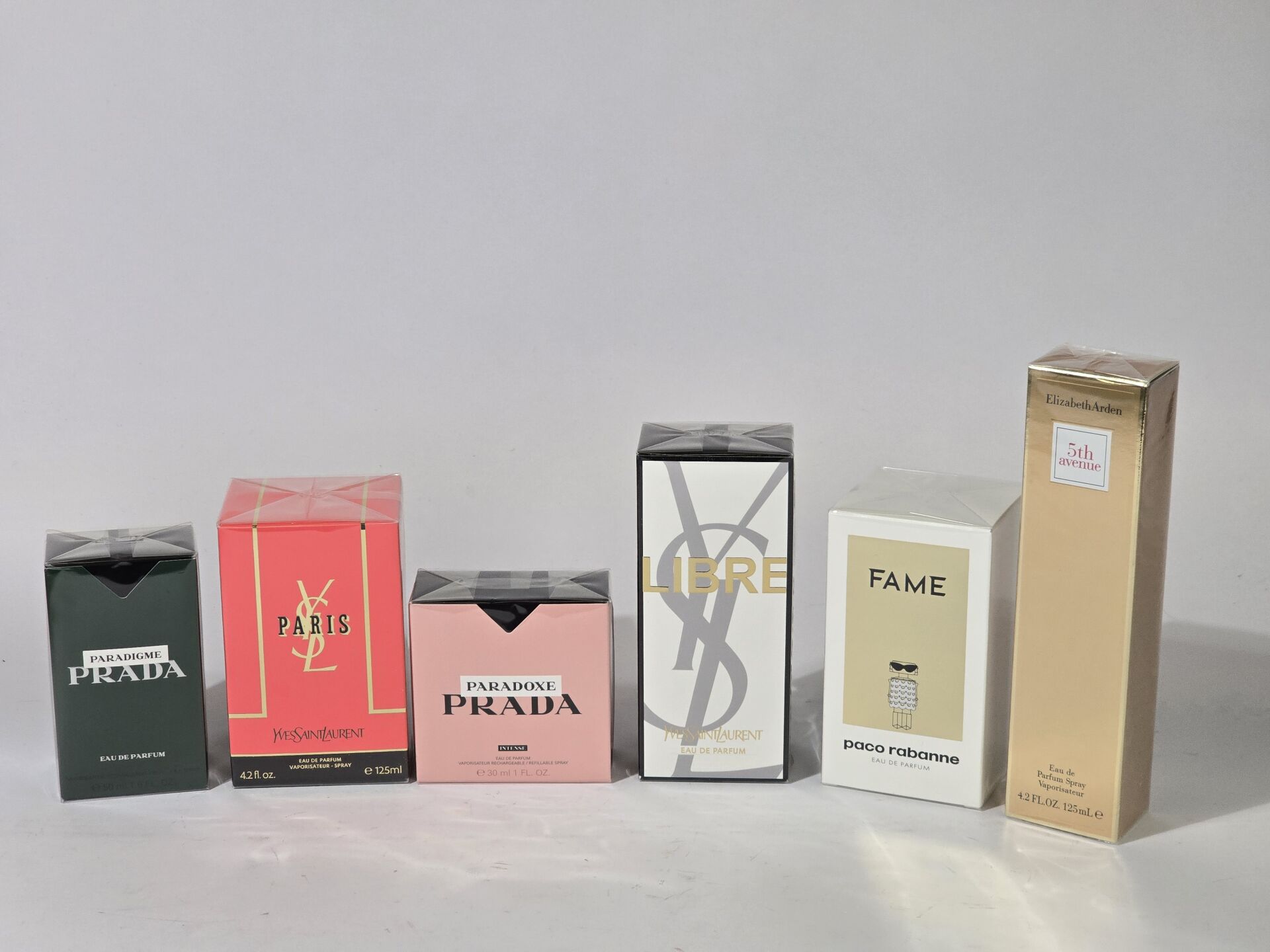 Ensemble d'environ 20 eaux de parfum dont : DIOR, YVES SAINT LAURENT, VERSACE, LANCOME, ARMANI, RABANNE, PRADA,... Différents contenants. En l'état