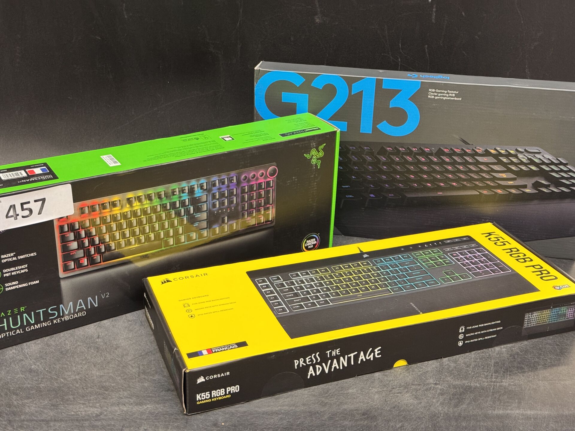 3 CLAVIERS : RAZER HUNTSMAN V2 / CORSAIR K55 RGB PRO / LOGITECH G213 ( FR avec scellés) EXPEDITION POSSIBLE (ce lot chez vous en France métropolitaine pour 32,18€) Lot issu de colis non réclamés : état de fonctionnement non garanti.
