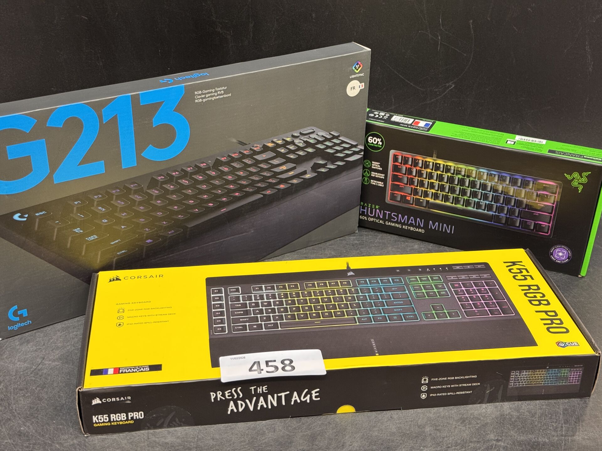 3 CLAVIERS : RAZER HUNTSMAN MINI / CORSAIR K55 RGB PRO / LOGITECH G213 ( FR avec scellés) EXPEDITION POSSIBLE (ce lot chez vous en France métropolitaine pour 32,18€) Lot issu de colis non réclamés : état de fonctionnement non garanti.