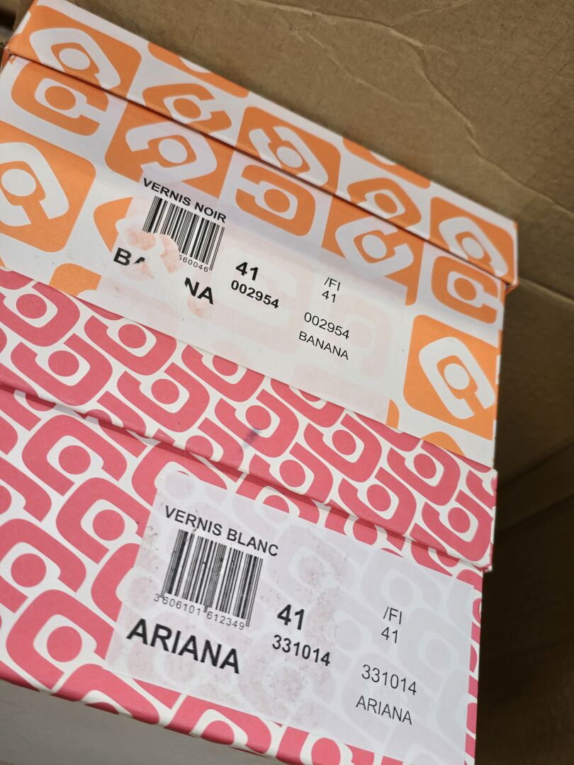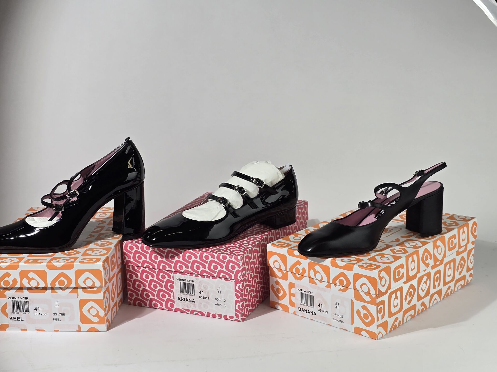 CAREL - Lot comprenant 5 paires de souliers dont : - 1 modèle "Banana" cuir vernis noir, - 1 modèle "Banana" cuir noir, - 1 modèle "Keel" cuir vernis noir, - 1modèle "Ariana" cuir vernis noir, - 1 modèle "Ariana" vernis Blanc. Pointure 41 Etat magasin (certaines boites abimées)