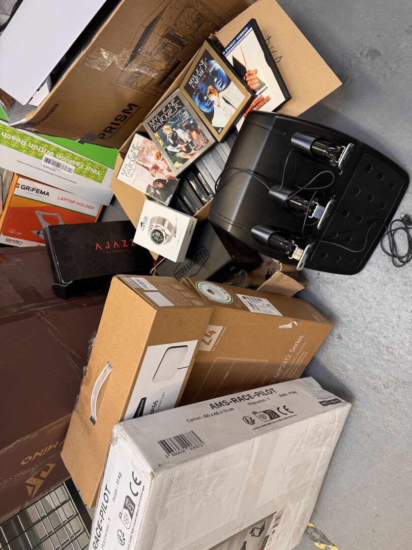 ENSEMBLE DE MATERIEL INFORMATIQUE & MULTIMEDIA DONT BOITIER PC, PC PORTABLE, ECRAN, FAUTEUIL GAMING, CASQUE, MANETTE, DVD (expédition sur devis) (dont produits avec traces d'usage) Lot issu de colis non réclamés : état de fonctionnement non garanti