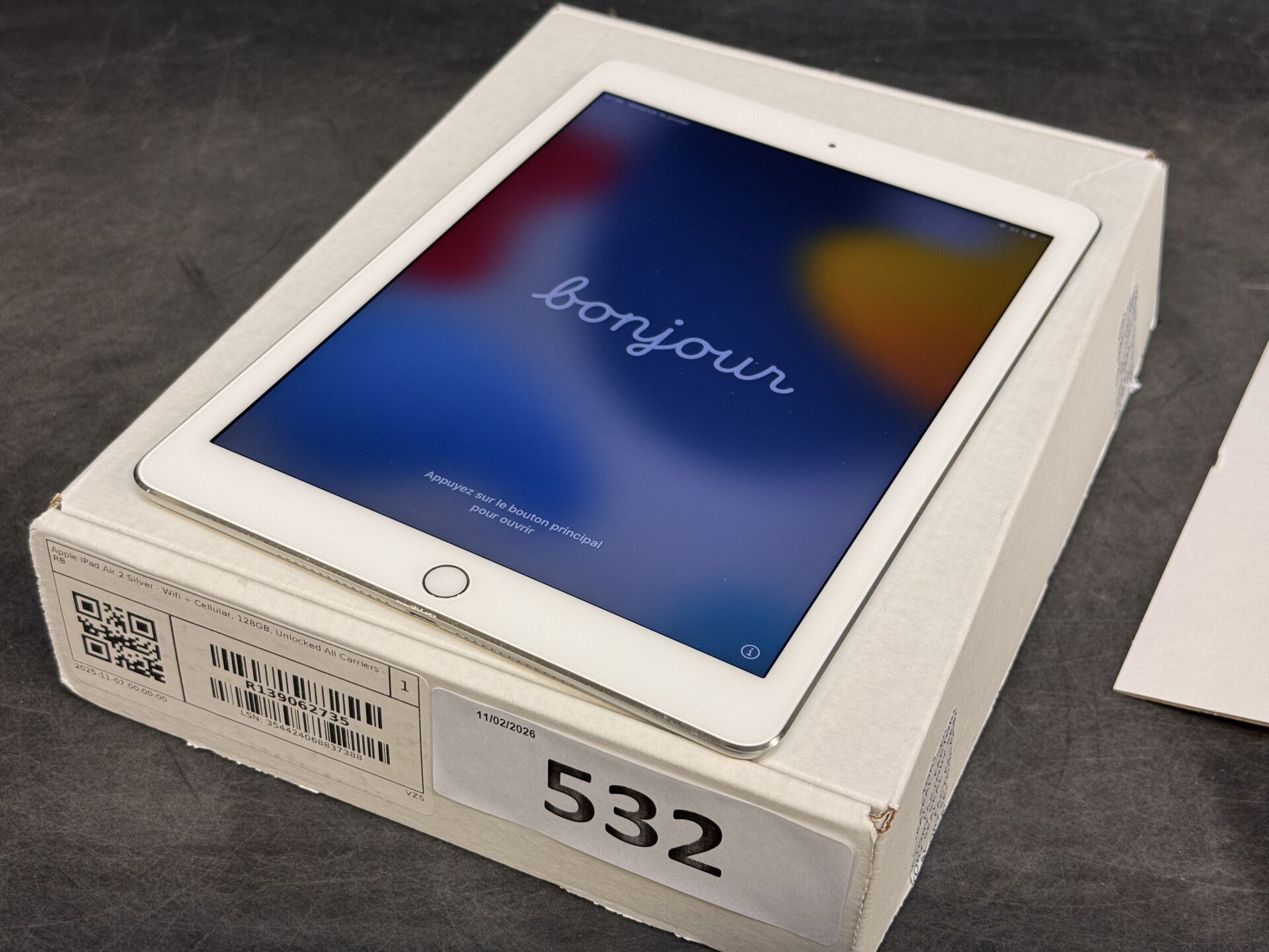 APPLE IPAD AIR 2 WIFI + CELLULAR 128GB SILVER SN DMPP28DLG5YQ EXPEDITION POSSIBLE (ce lot chez vous en France métropolitaine pour 25,80€) Lot issu de colis non réclamés : état de fonctionnement non garanti. (sans emballage ni accessoire)