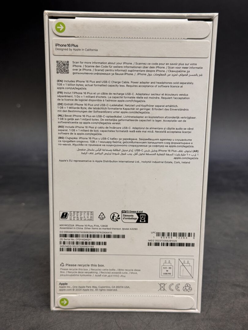 APPLE IPHONE 16 PLUS PINK 128GB (avec scellés) SN CFDY4QWQY1 EXPEDITION POSSIBLE (ce lot chez vous en France métropolitaine pour 25,80€) Lot issu de colis non réclamés : état de fonctionnement non garanti.