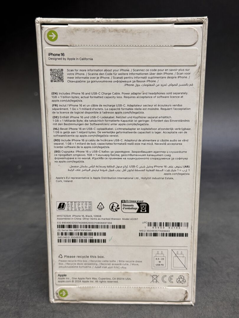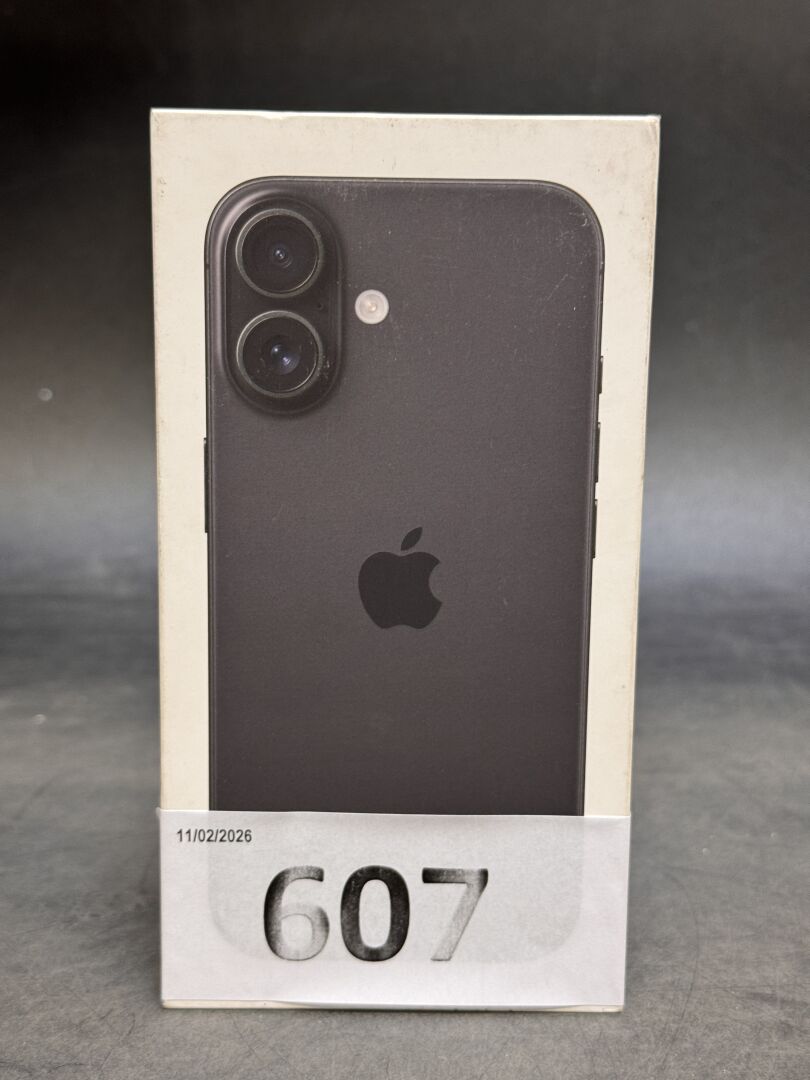 APPLE IPHONE 16 BLACK 128GB (avec scellés) SN MRYFXWV6WX EXPEDITION POSSIBLE (ce lot chez vous en France métropolitaine pour 25,80€) Lot issu de colis non réclamés : état de fonctionnement non garanti.