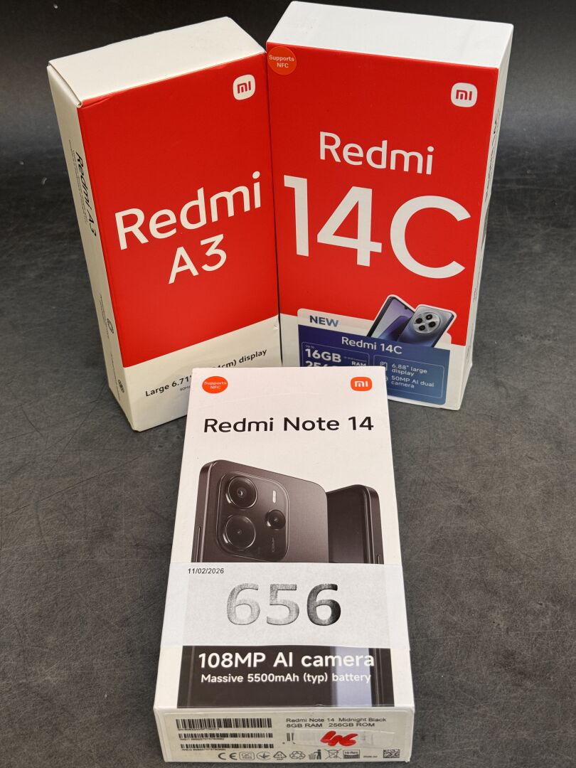 3 TELEPHONES REDMI : NOTE 14 / 14C / A3 (avec scellés) EXPEDITION POSSIBLE (ce lot chez vous en France métropolitaine pour 25,80€) Lot issu de colis non réclamés : état de fonctionnement non garanti, pouvant être bloqué)