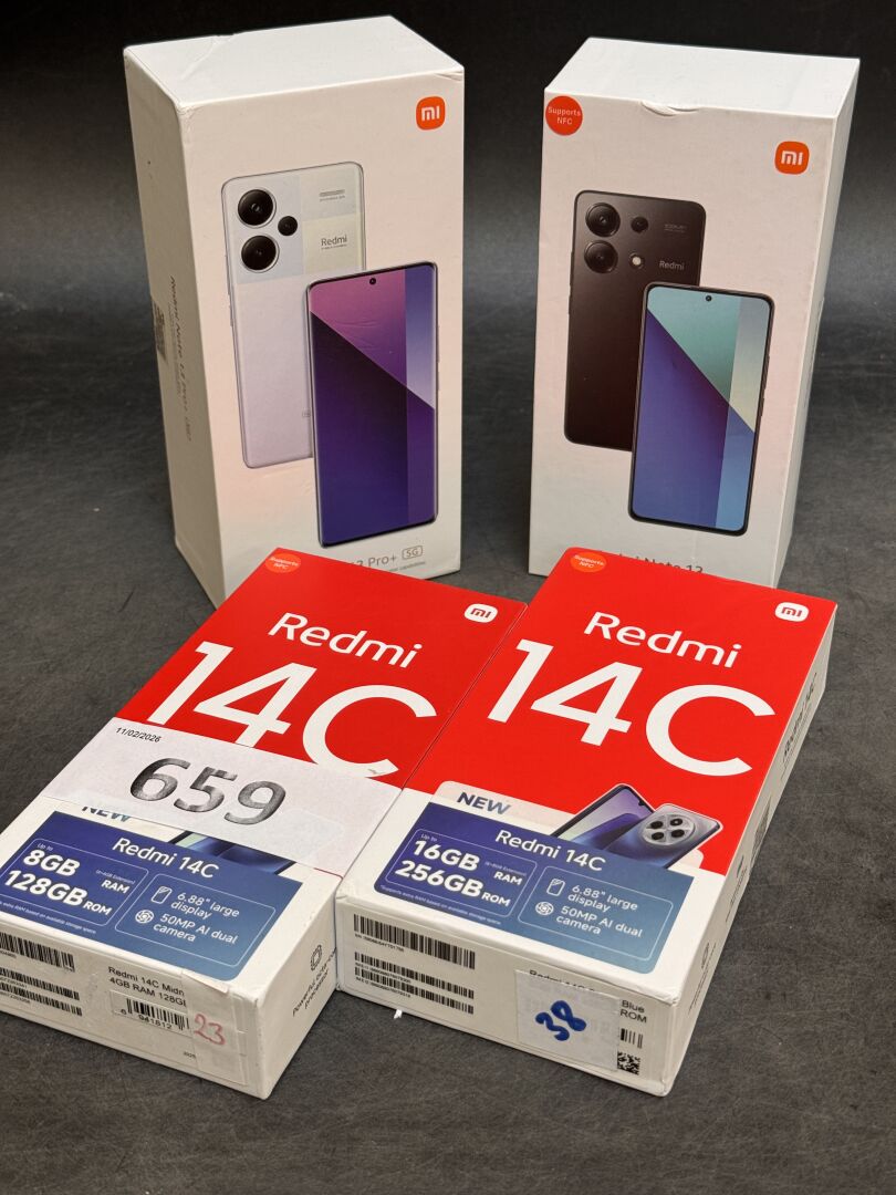 4 TELEPHONES REDMI : NOTE 13 PRO+ 5G / NOTE 13 / 2 14C (avec scellés) EXPEDITION POSSIBLE (ce lot chez vous en France métropolitaine pour 27,45€) Lot issu de colis non réclamés : état de fonctionnement non garanti, pouvant être bloqué)