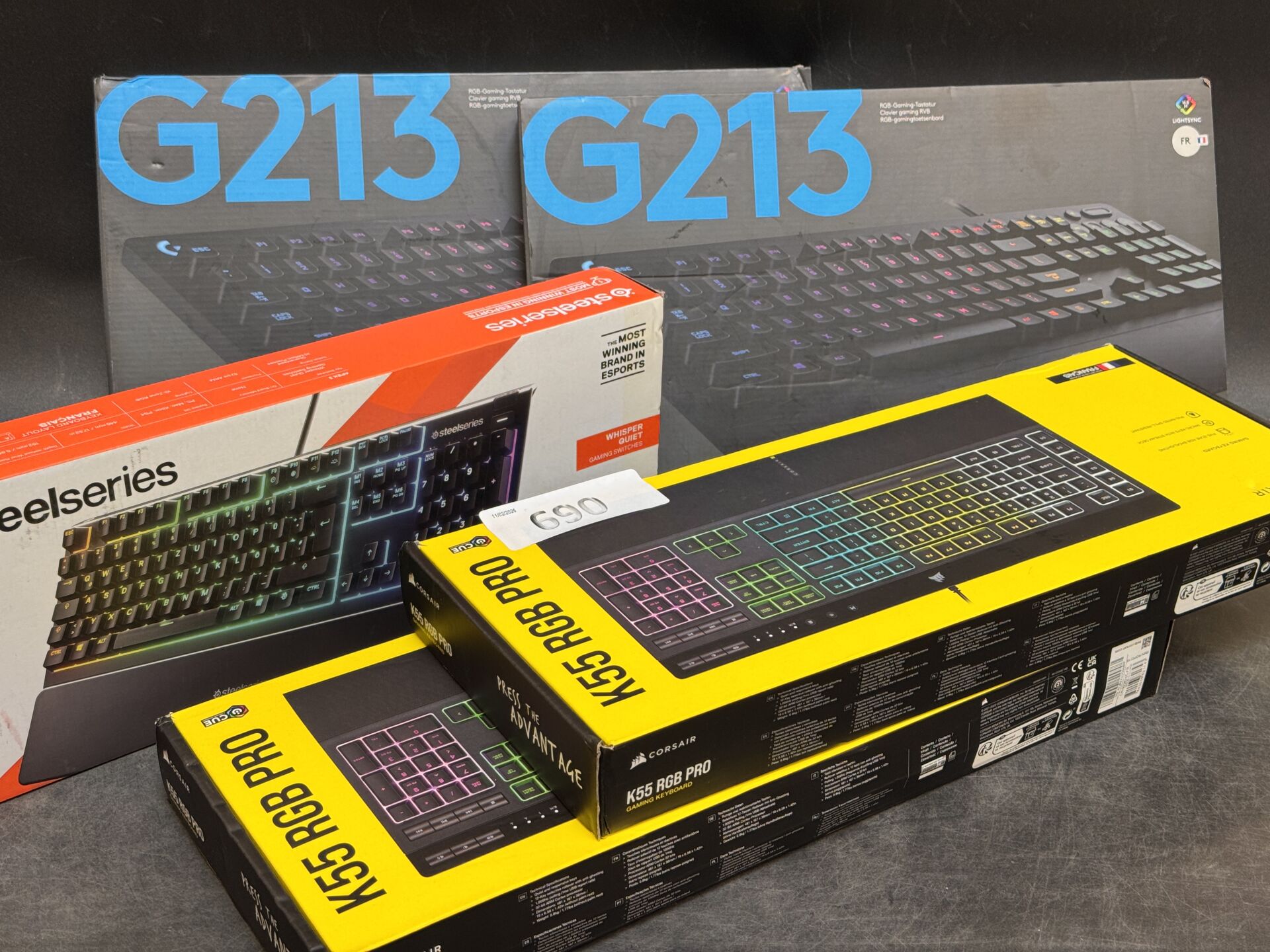 5 CLAVIERS : 2 CORSAIR K55 RGB PRO / 2 LOGITECH G213 / STEELSERIES APEX 3 (FR avec scellés) EXPEDITION POSSIBLE (ce lot chez vous en France métropolitaine pour 32,18€) Lot issu de colis non réclamés : état de fonctionnement non garanti.