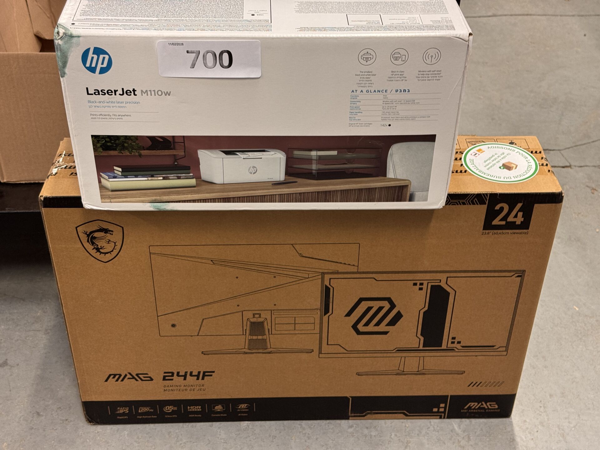 MONITEUR MSI 23,8" MAG 244F + IMPRIMANTE HP LASER JET M110V (expédition sur devis) Lot issu de colis non réclamés : état de fonctionnement non garanti.