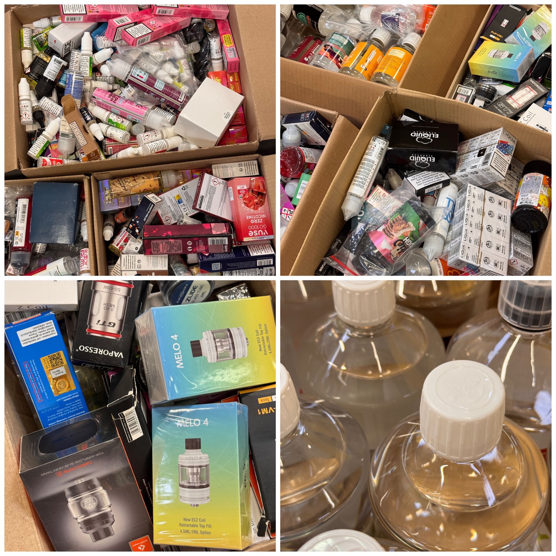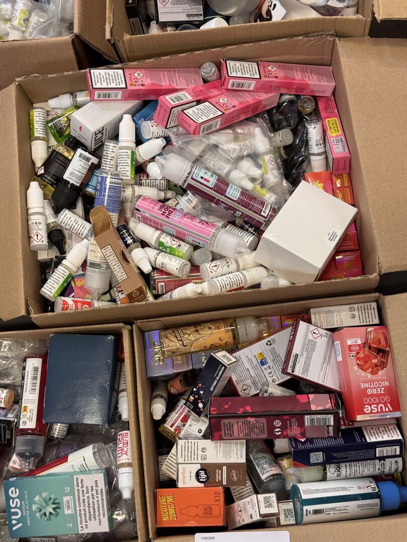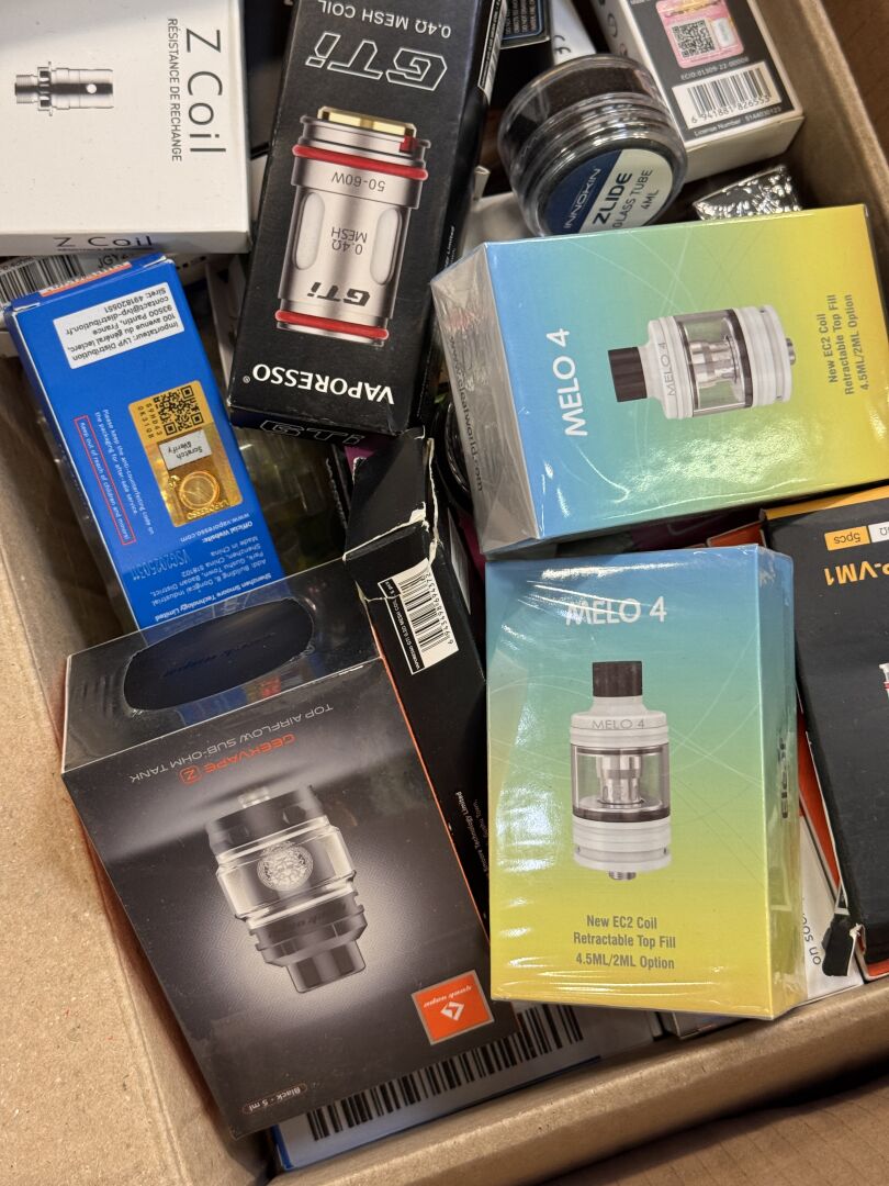 ENVIRON 50KG DE LIQUIDES ET ACCESSOIRES POUR CIGARETTES ELECTRONIQUES DONT GEEKVAPE, INNOKIN, A&L (expédition sur devis) Lot issu de colis non réclamés : état de fonctionnement non garanti.