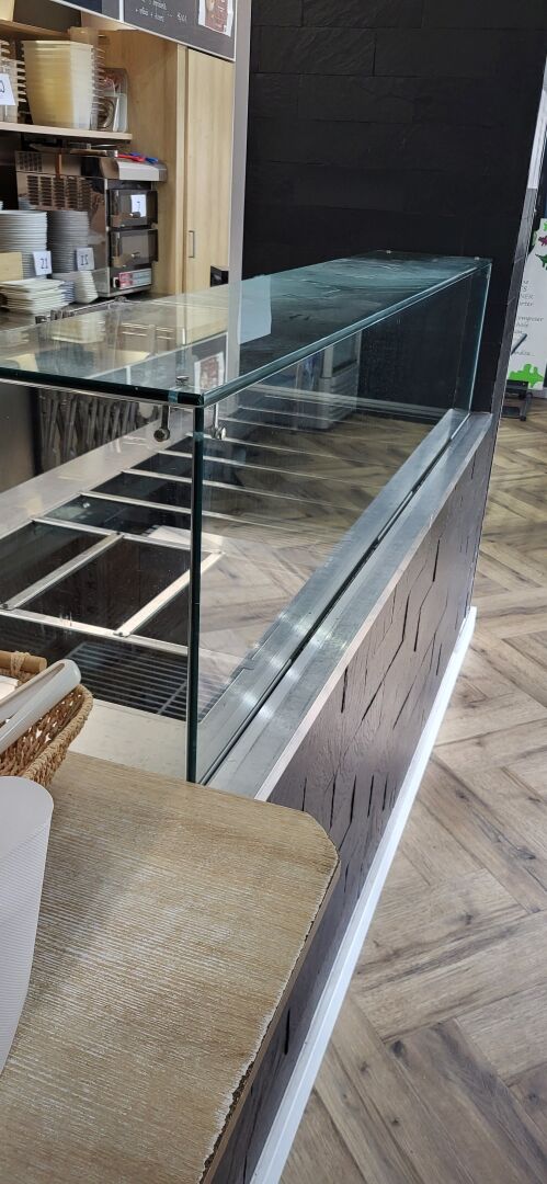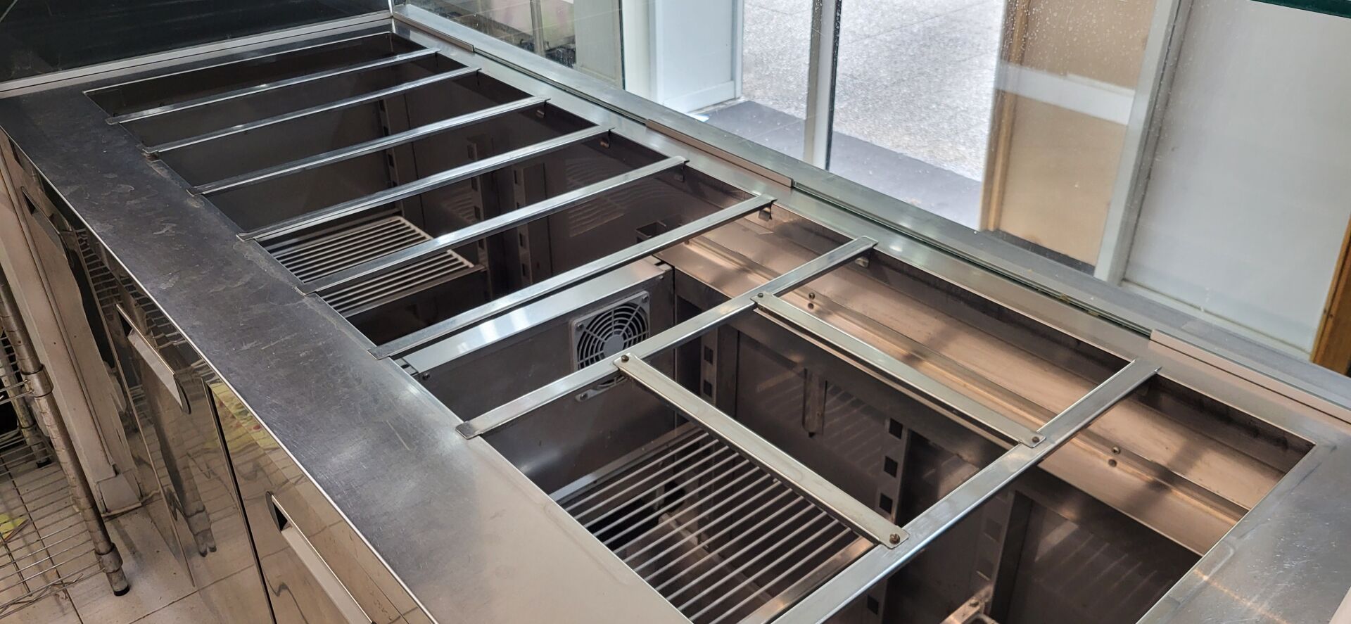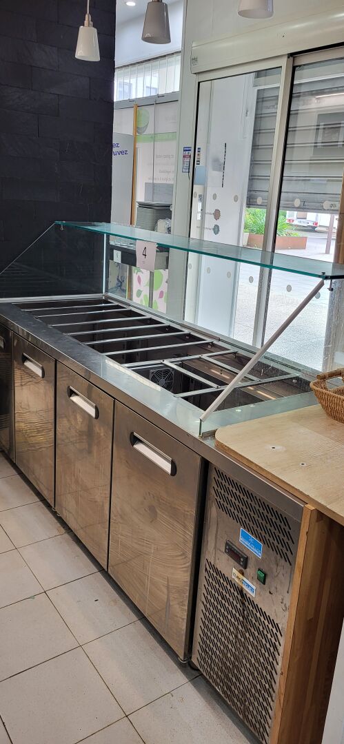 1 tour réfrigéré inox 4 portes avec saladette, moteur logé à droite , EUROPROJET 223 x 75 x 115 cm (prévoir le démontage pour le sortir)