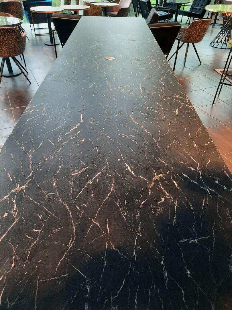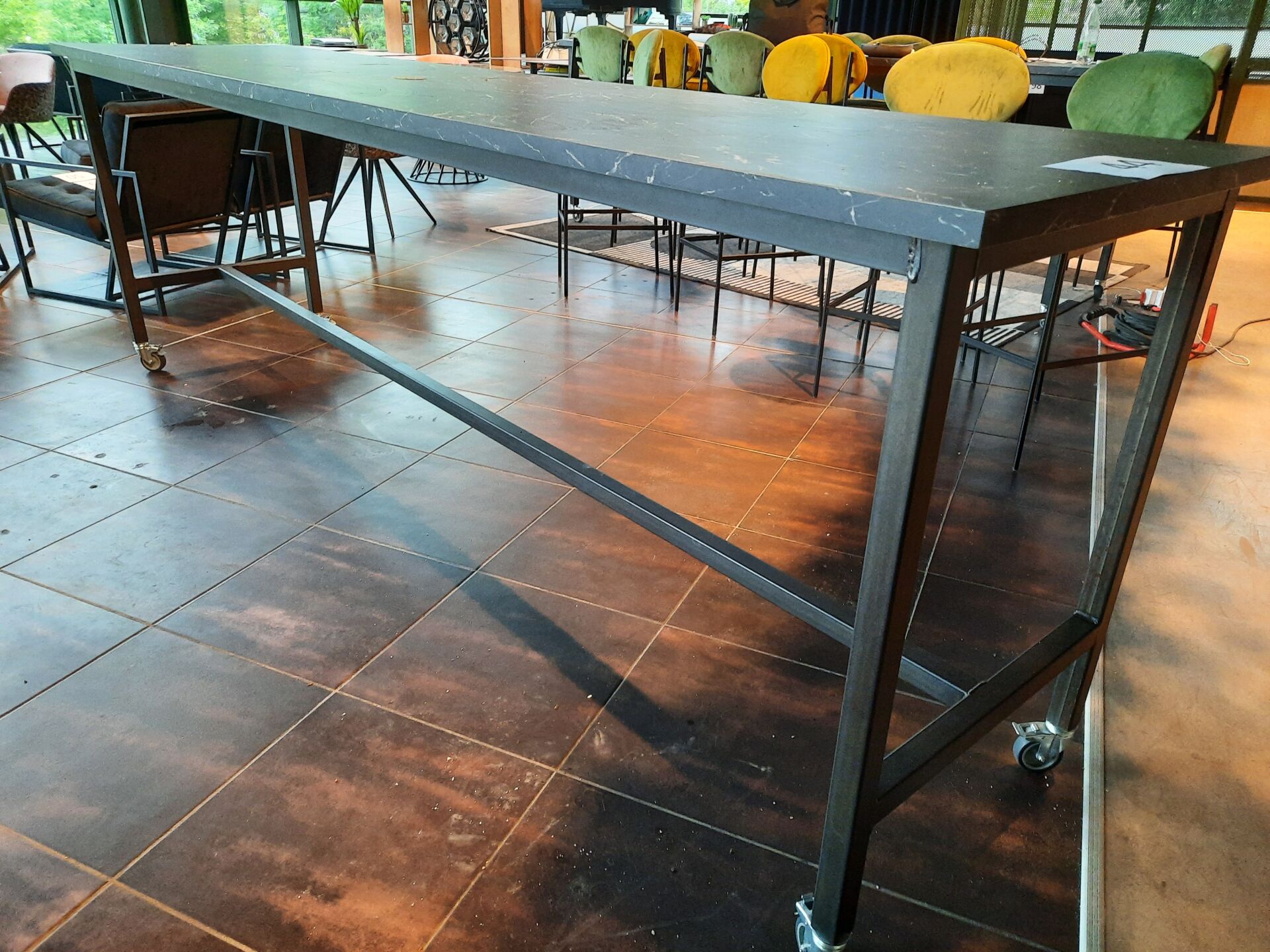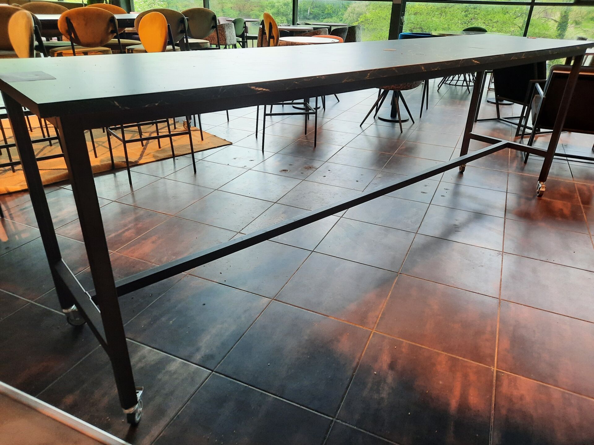 Table haute rectangulaire roulante, plateau façon marbre, 12 couverts piètement métal laqué noir (300 x 70 cm)
