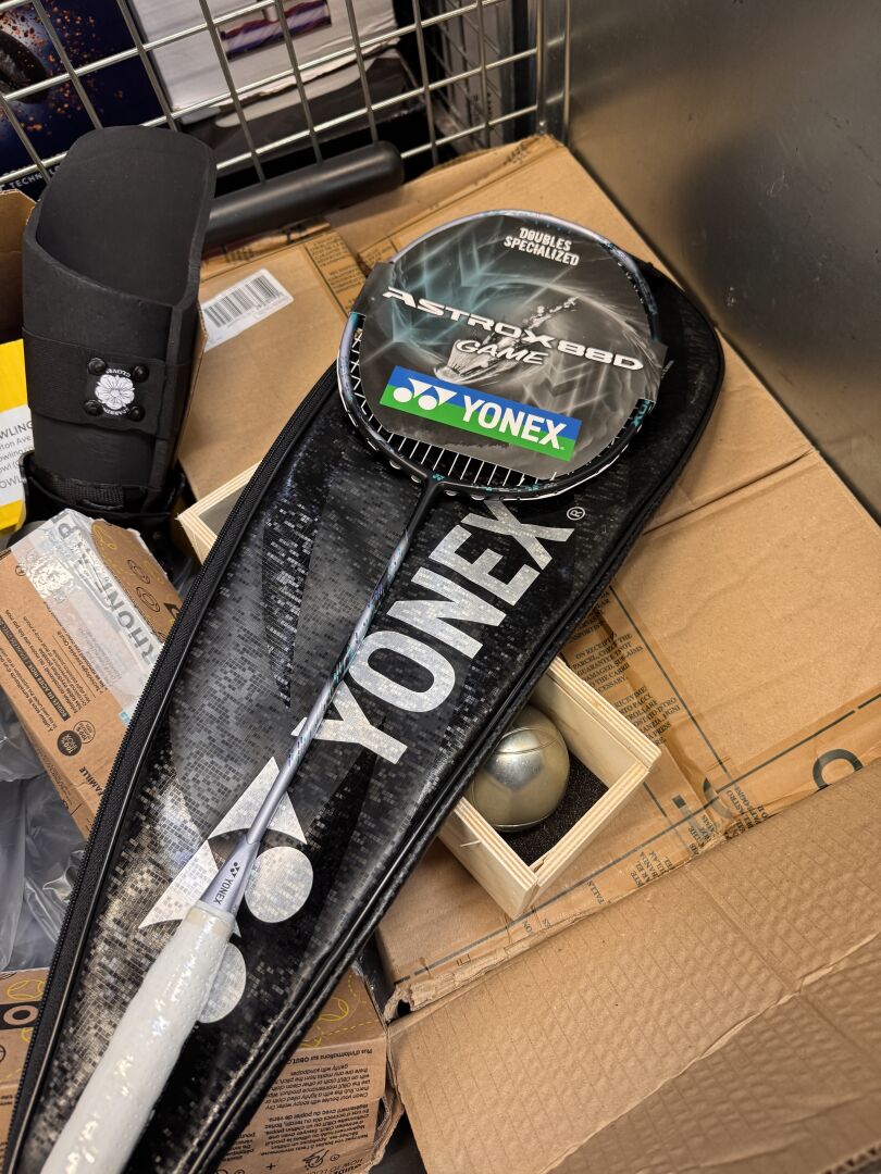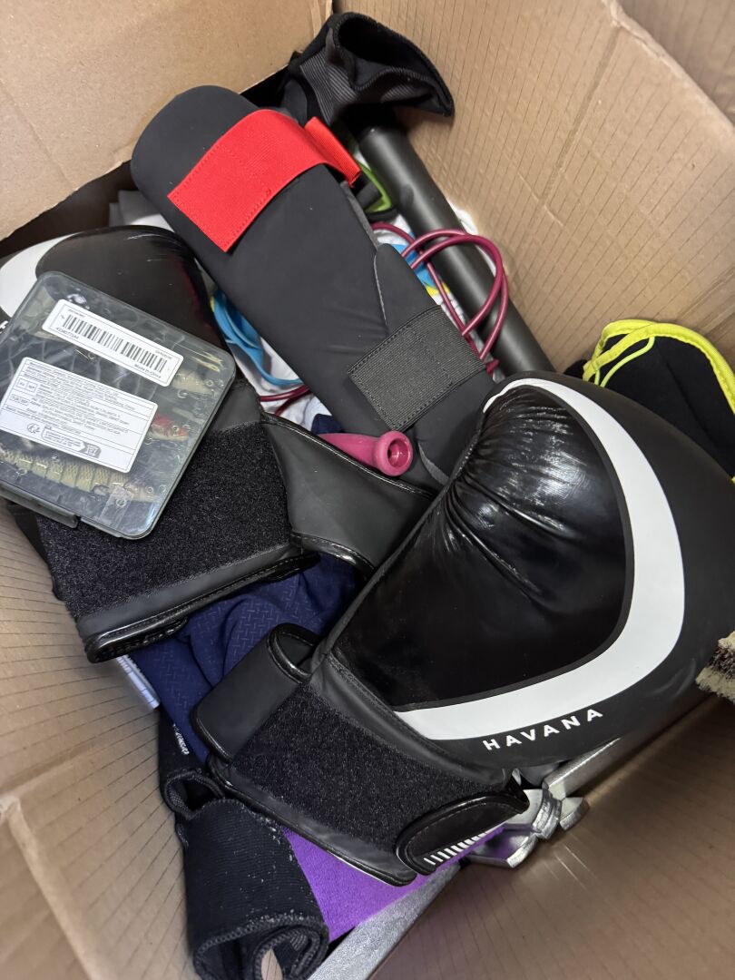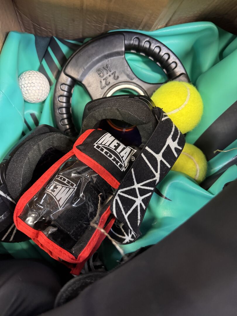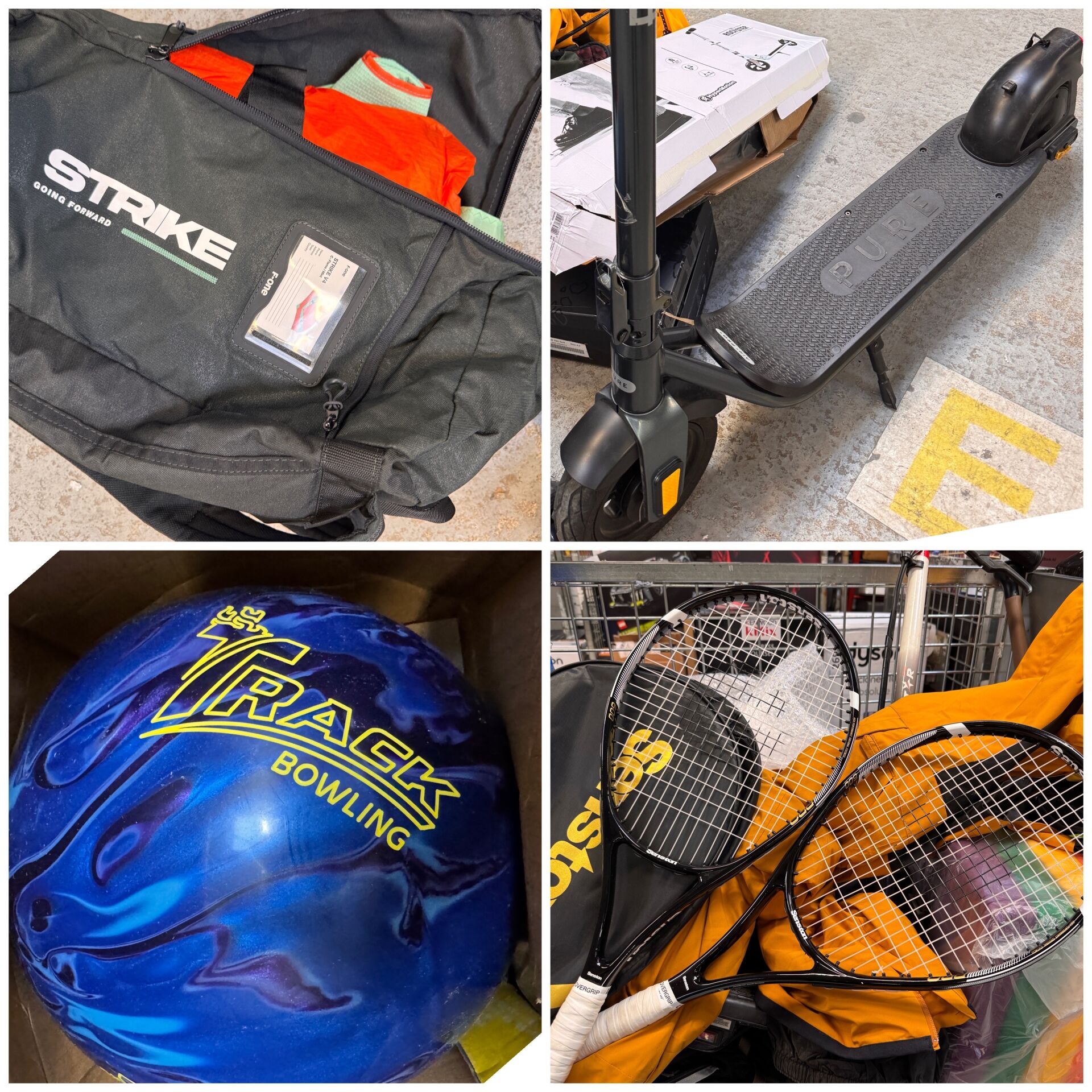 FORT ENSEMBLE D'ARTICLES SPORT & LOISIRS DONT TROTTINETTE, TAPIS, POIDS, RAQUETTE, BOULE DE BOWLING (expédition sur devis) (traces d'usage, retour sav, avarie de transport, seconde main, en l'état)