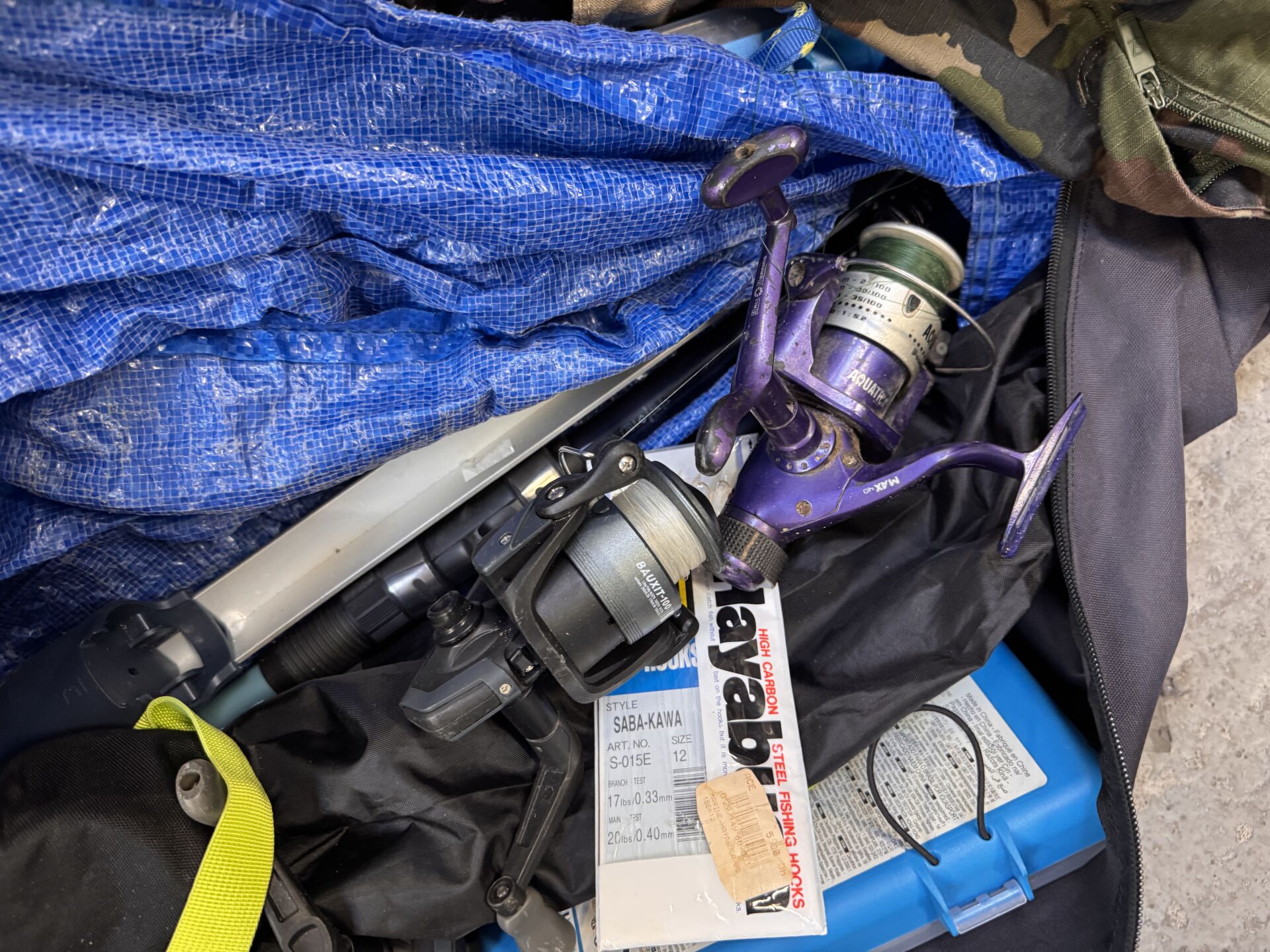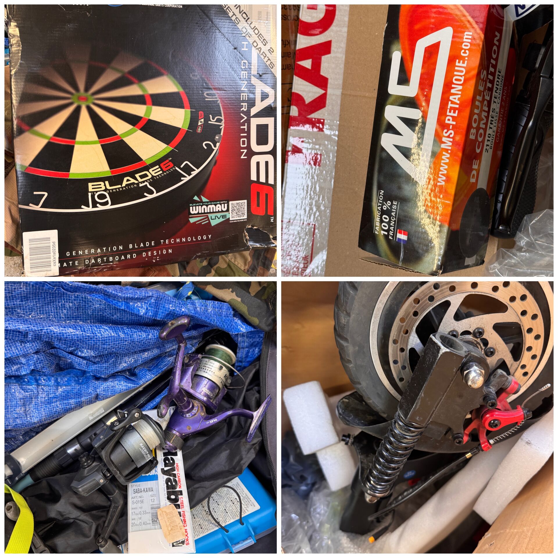 FORT ENSEMBLE D'ARTICLES SPORT & LOISIRS DONT TROTTINETTES, MATERIEL DE PËCHE, PETANQUE, TEXTILE HIVER (expédition sur devis) (traces d'usage, retour sav, avarie de transport, seconde main, en l'état)