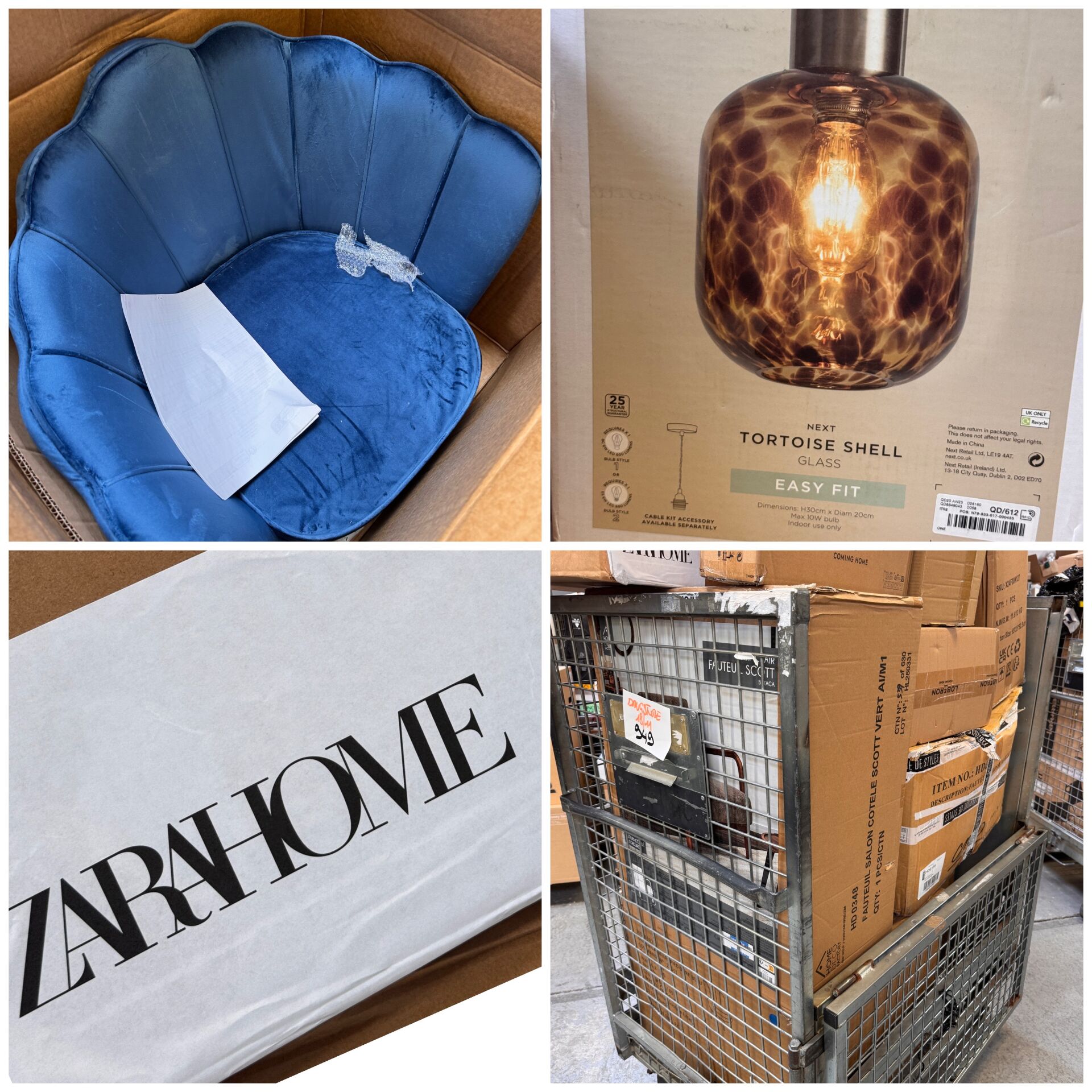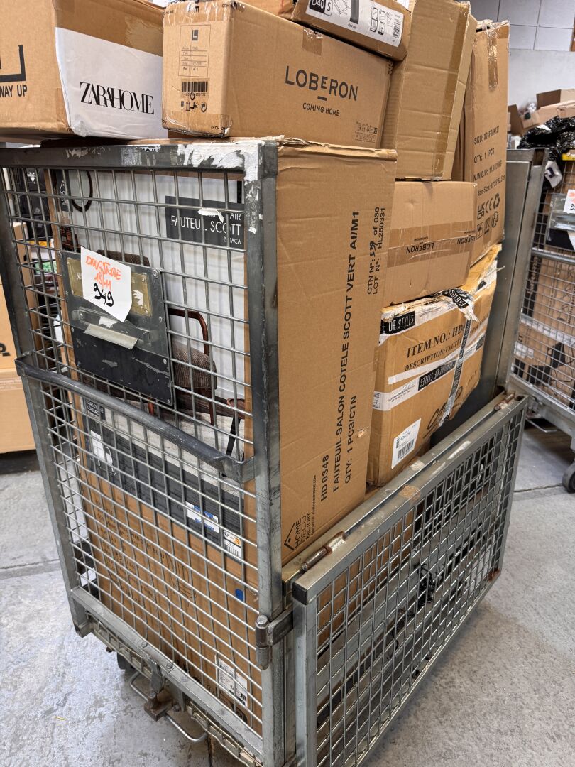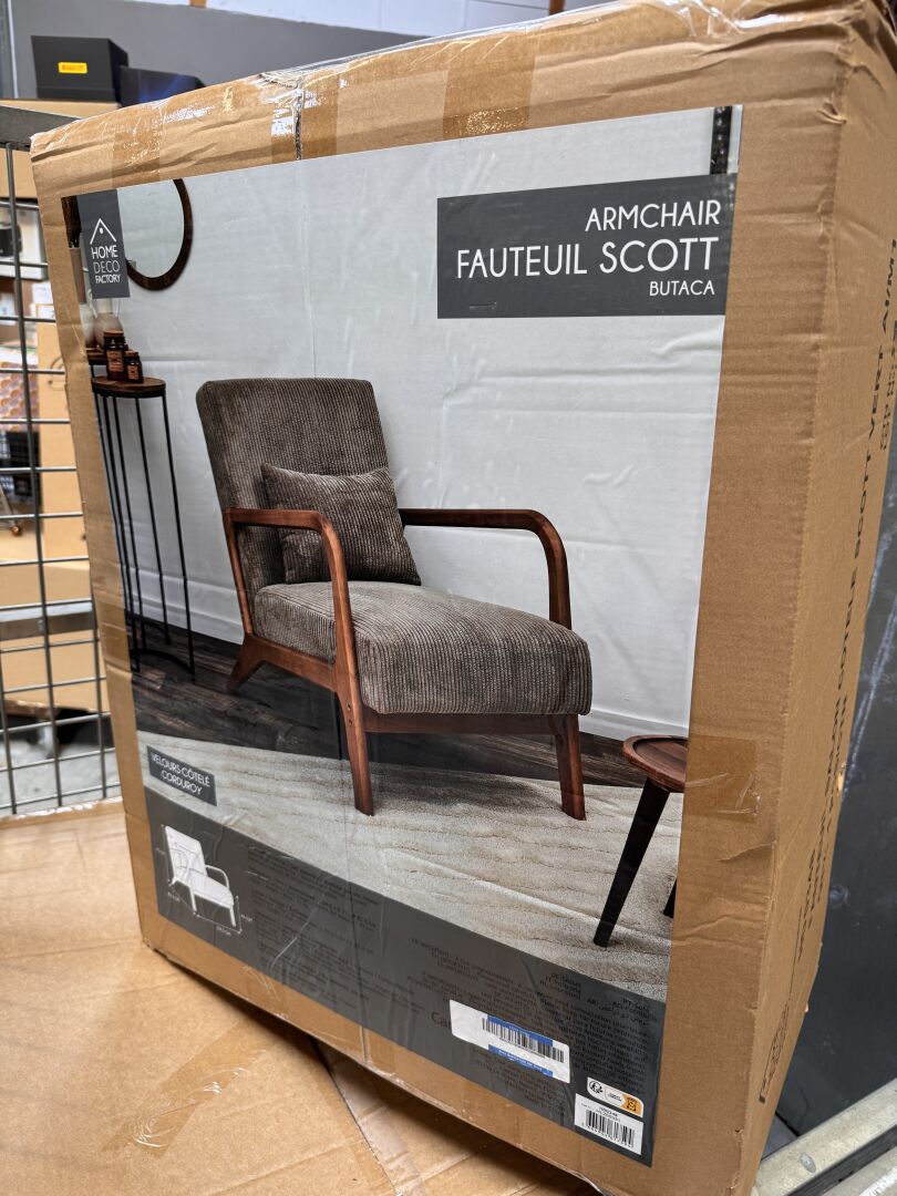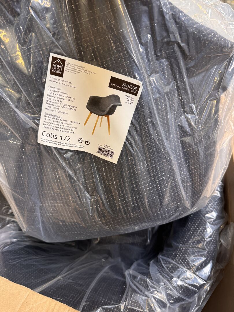 FORT ENSEMBLE DE PETITS MOBILIERS ET DECORATIONS (environ 1m3) DONT FAUTEUIL, LUMINAIRES (expédition sur devis) Lot issu de colis non réclamés : état de fonctionnement non garanti.
