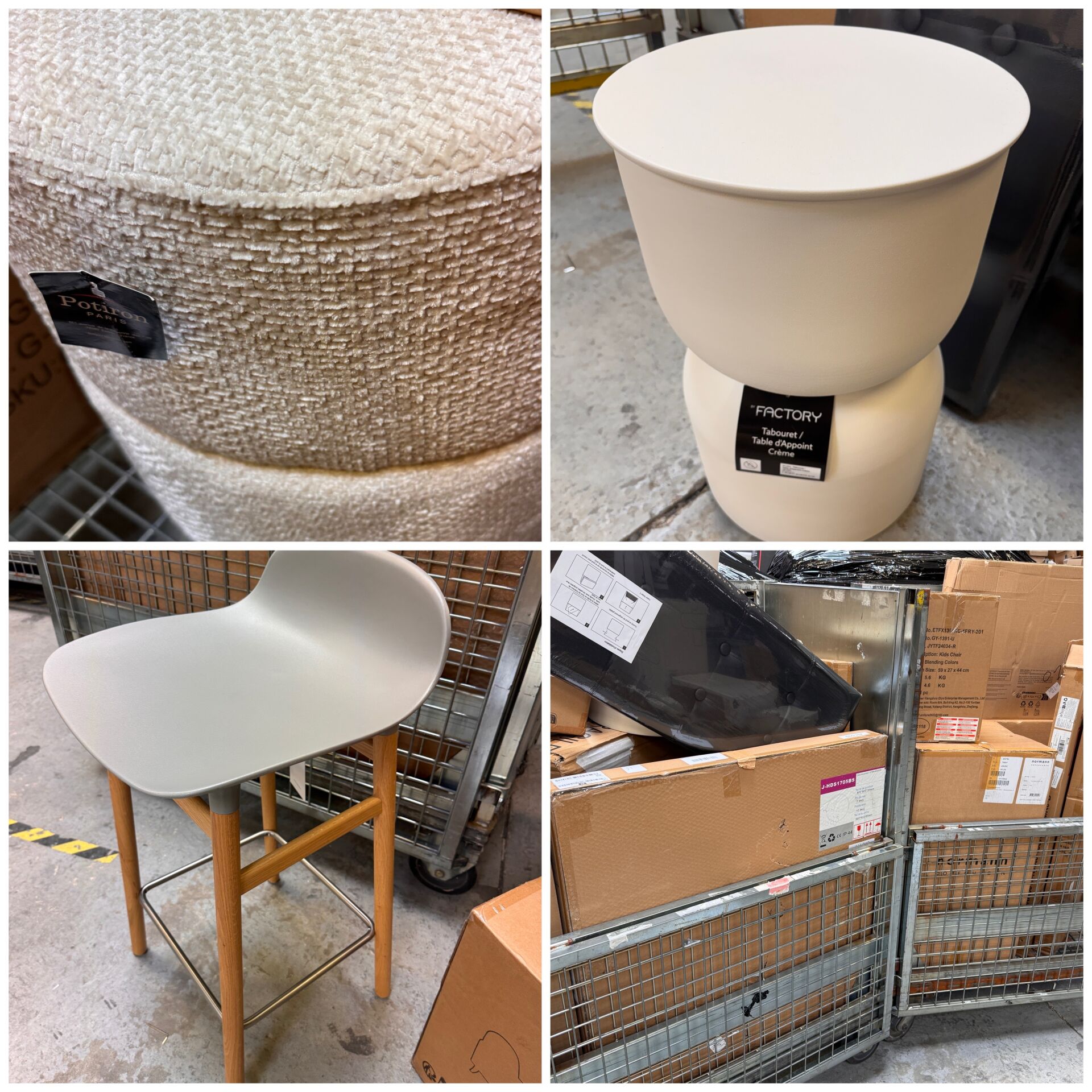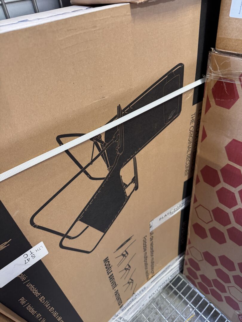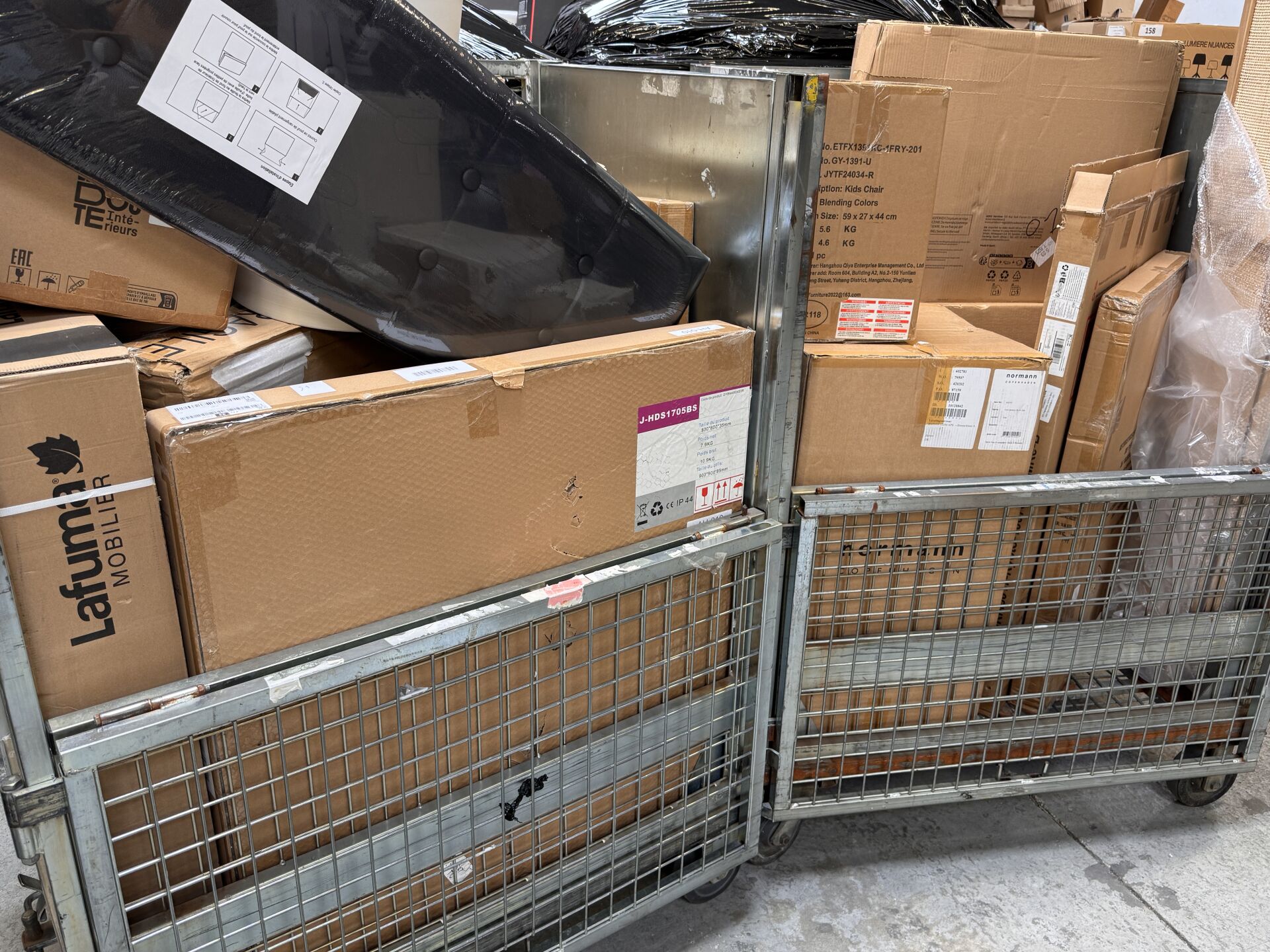 FORT ENSEMBLE DE PETITS MOBILIERS ET DECORATIONS (environ 1m3) DONT MIROIR, TABLE, TRANSAT (expédition sur devis) Lot issu de colis non réclamés : état de fonctionnement non garanti.