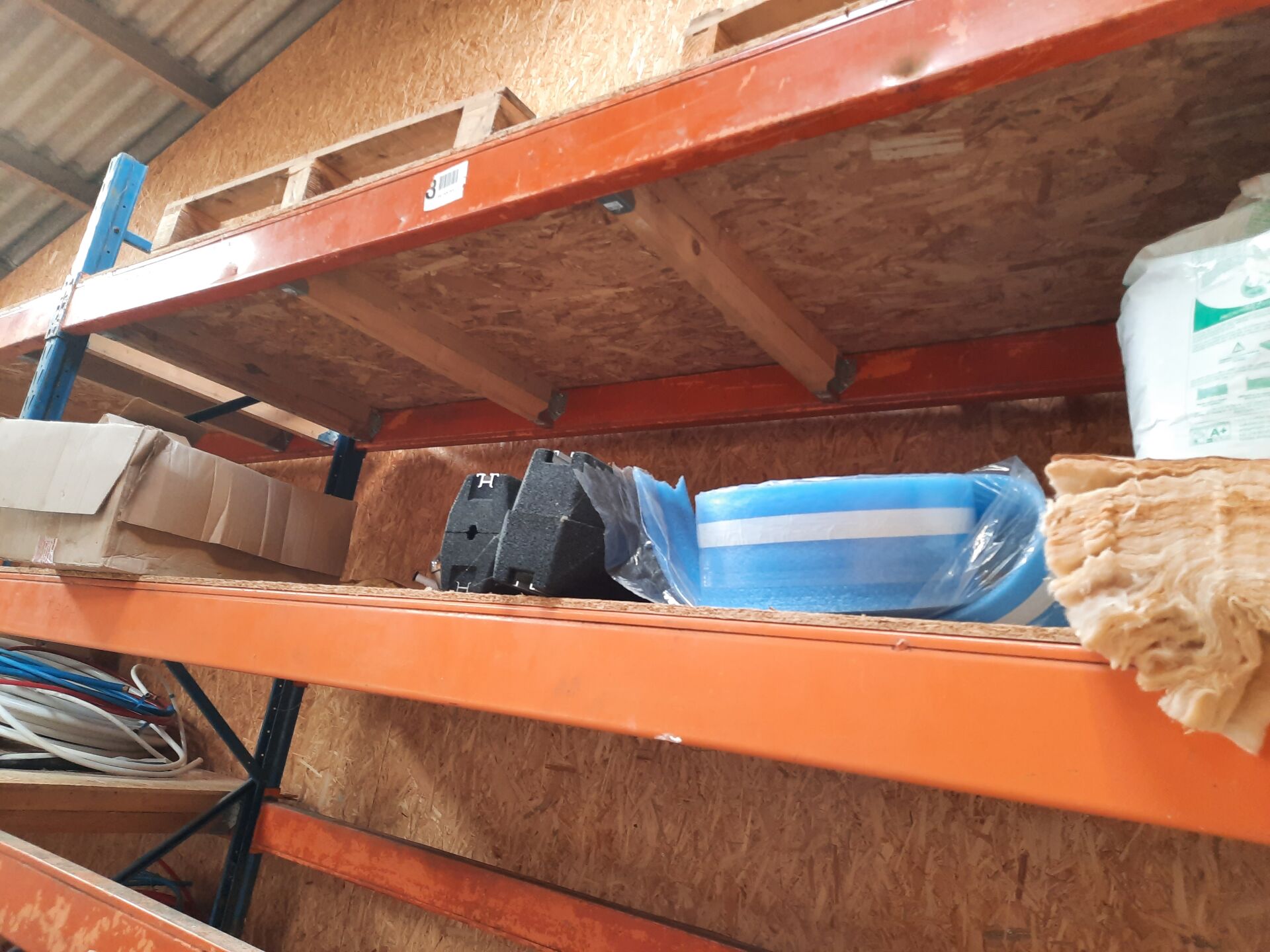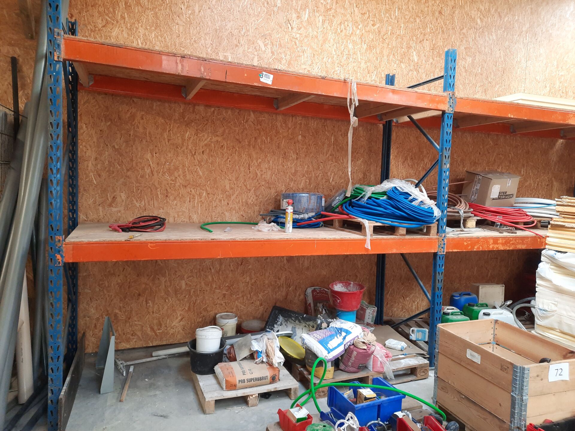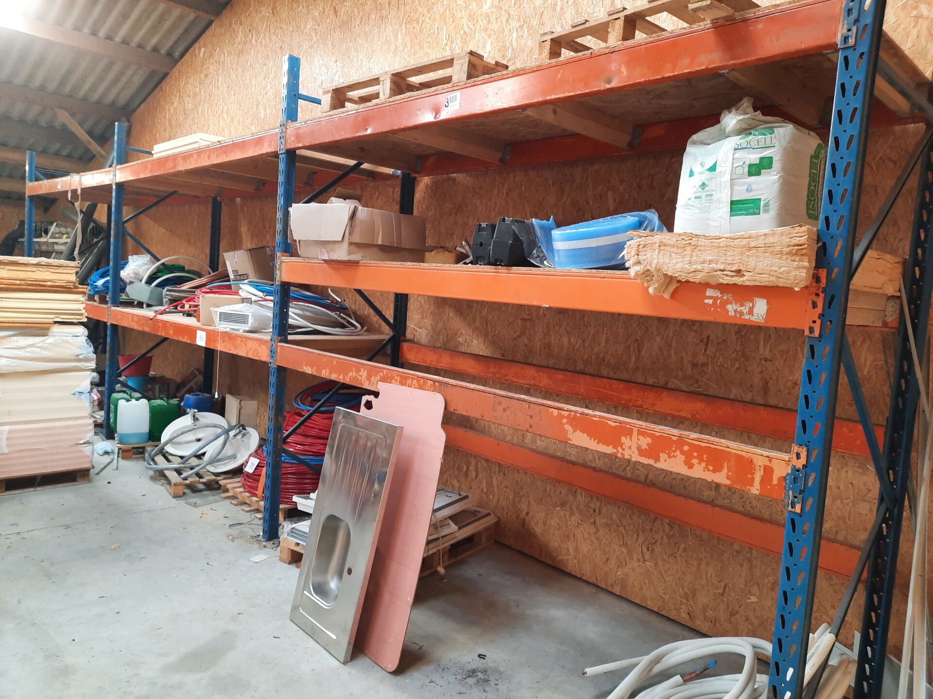 Rack en métal laqué bleu et orange comprenant 4 échelles (environ 3 m), 14 lisses (environ 2.7 m) Les lisses sont solidarisées par des traverses bois, les planchers sont vissés sur les traverses A DEMONTER PROPREMENT SANS DOMMAGE A L IMMEUBLE - PREVOIR OUTILS POUR DEMONTAGE