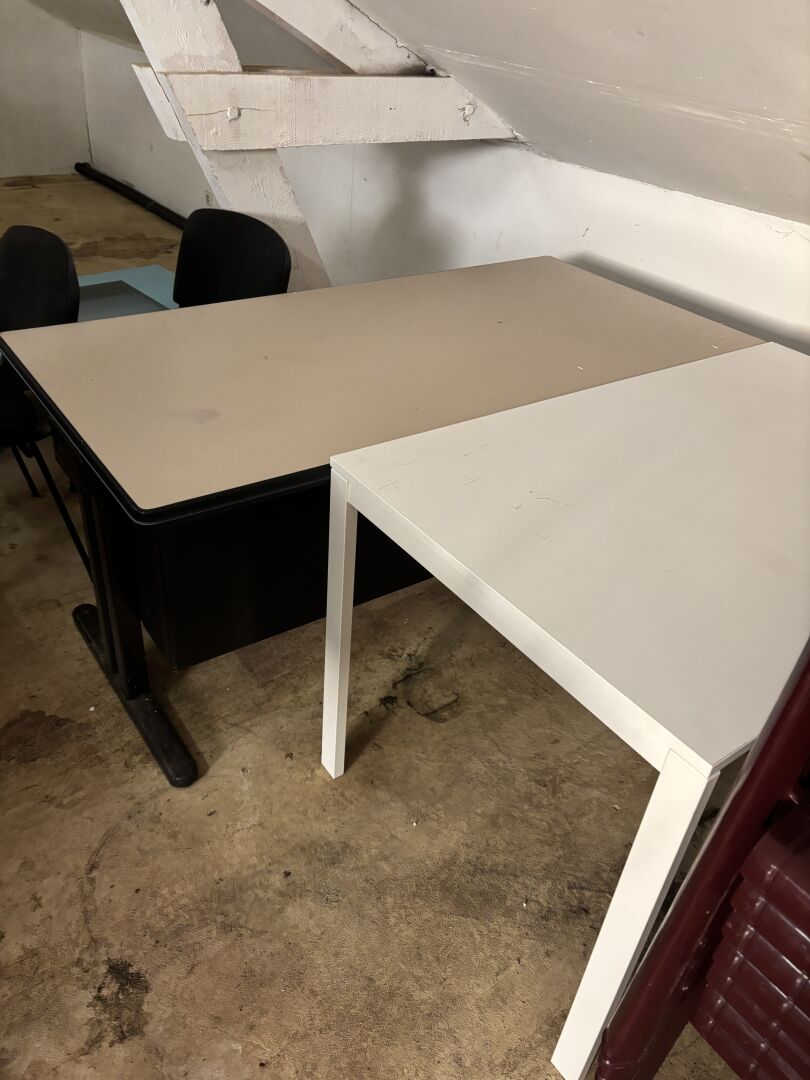 Table en mélaminé blanc et 2 chaises tissu noir Bureau en métal et mélaminé beige