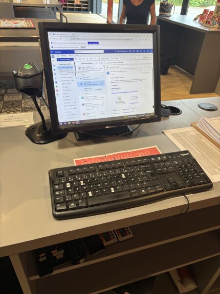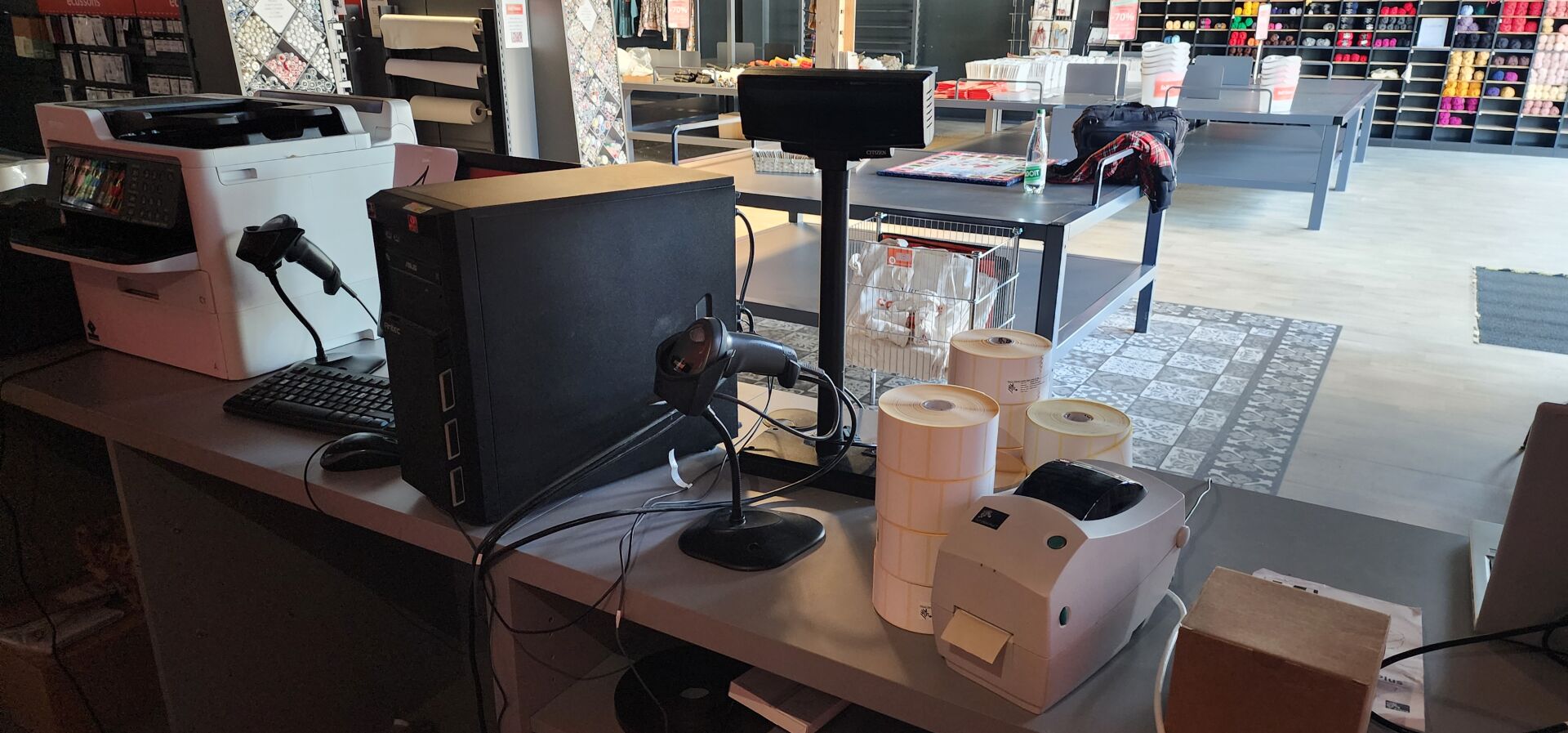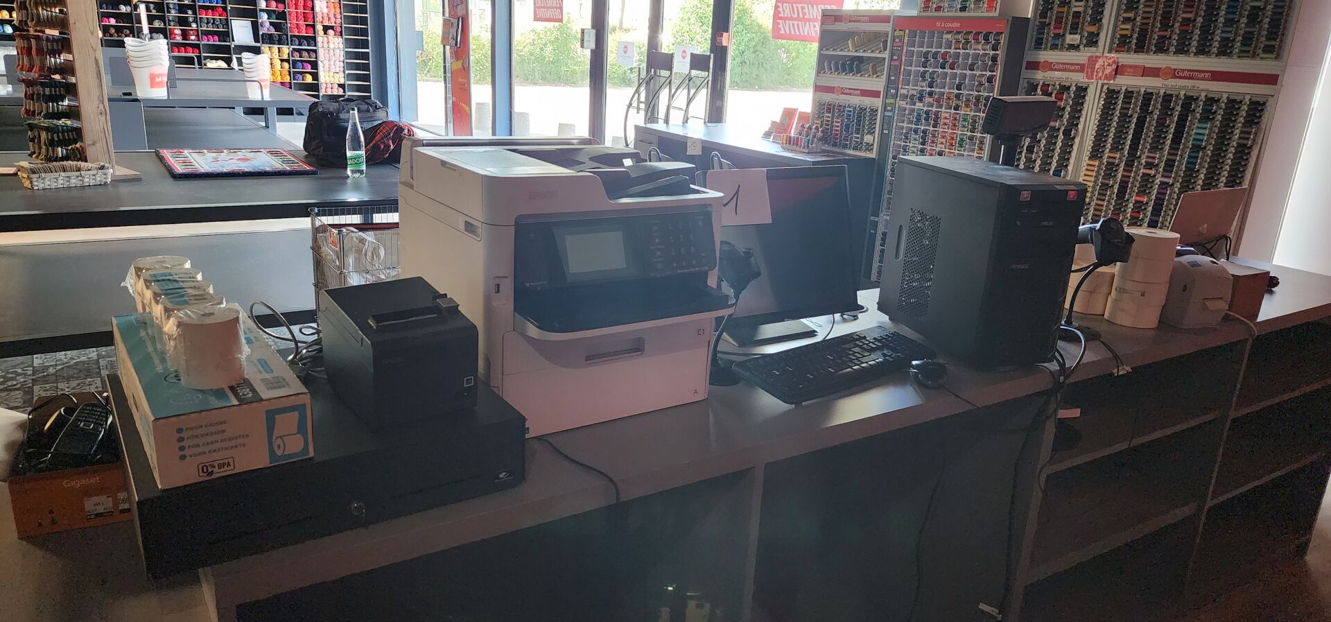 Configuration informatique composée de : - Unité centrale ANTEC RYZEN 3 - Copieur EPSON modèle WORKFORCE PRO WF C 5795 - Écran sans marque ni modèle apparent - Clavier - Souris - 2 douchettes SYMBOL - Tiroir caisse - imprimante à tickets EPSON et imprimante à étiquette ZEBRA modèle 1828+