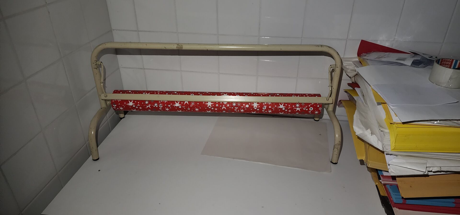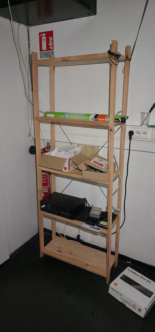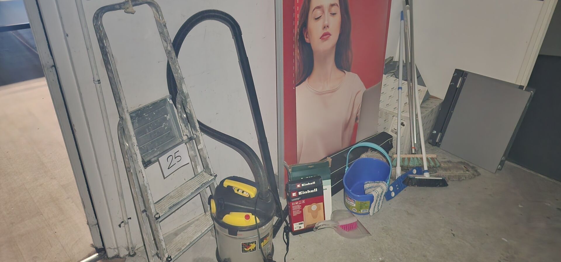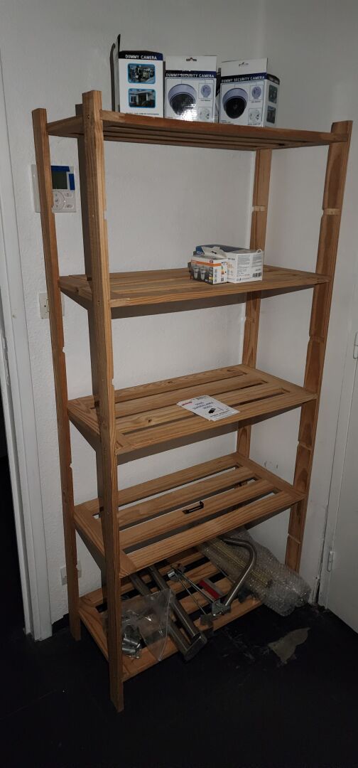 Ensemble d'outillage comprenant : Aspirateur bidon LAVOR sans modèle apparent Escabeau aluminium à 2 marches (état moyen) Dévidoir à poser en métal laqué gris On joint : 2 étagères en pin