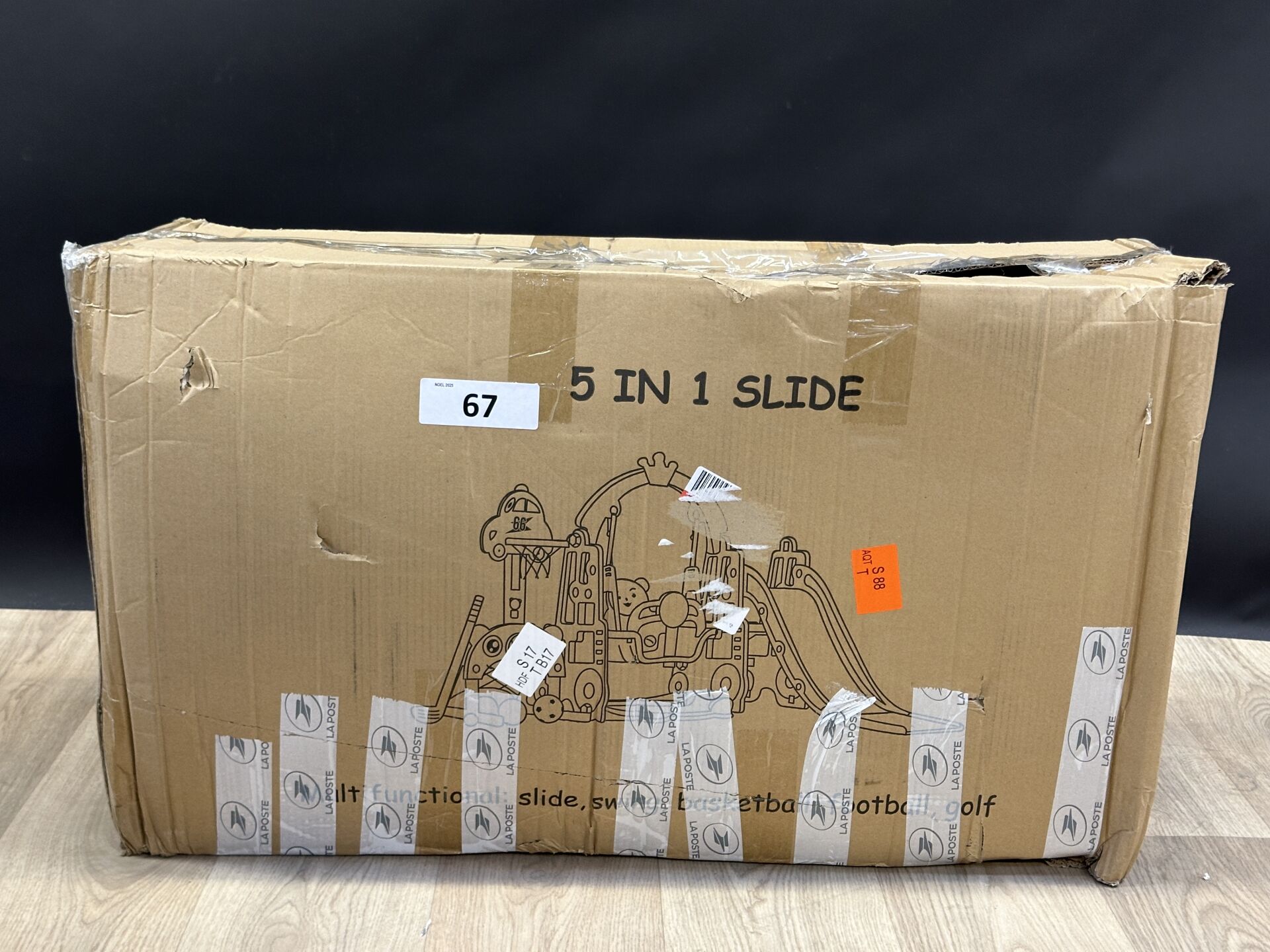 Structure de jeux pour enfant avec toboggan, balançoire et panier de basket, en PVC couleur...