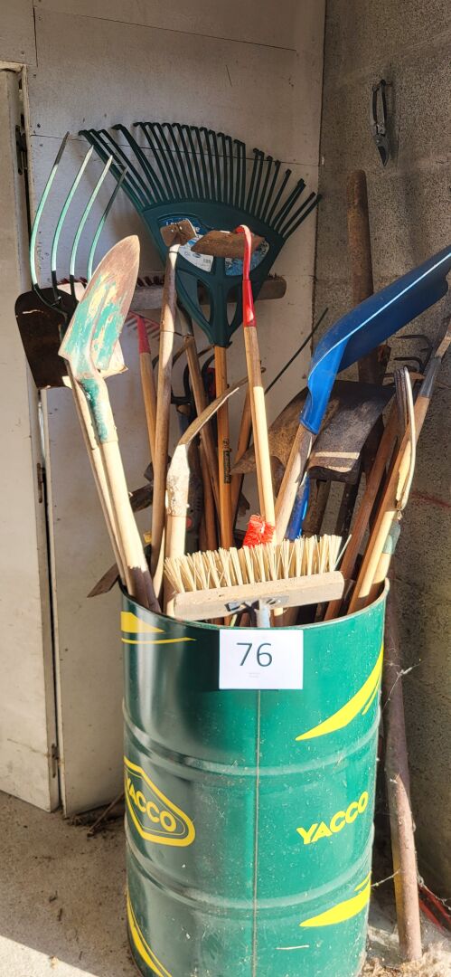 1 lot d’outillage de jardinage (pelles, fourches, balai à feuille, etc), 1 brouette
