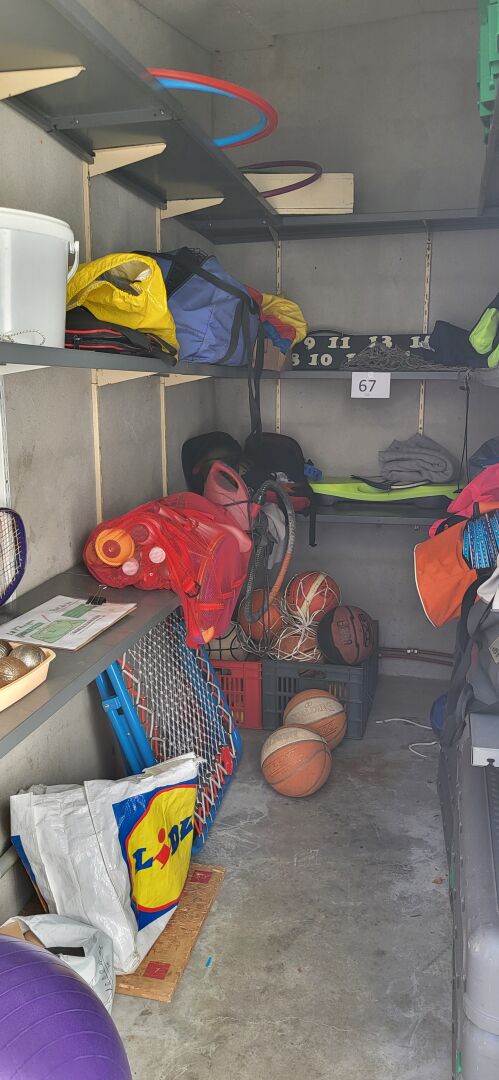 1 lot de matériel de sport dont 10 steps, 12 ballons, 30 raquettes de badminton, éléments pour...