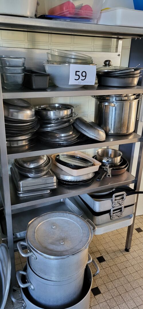 1 lot d’ustensiles de cuisine dont faitouts, passoires, casseroles, poêles, plats inox,...
