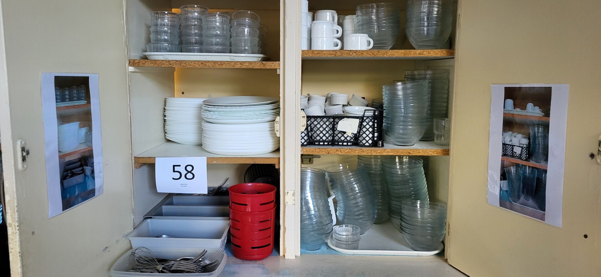 Dans un buffet : 1 lot de vaisselle dont environ 100 assiettes porcelaine blanche, 200 bols, 60...