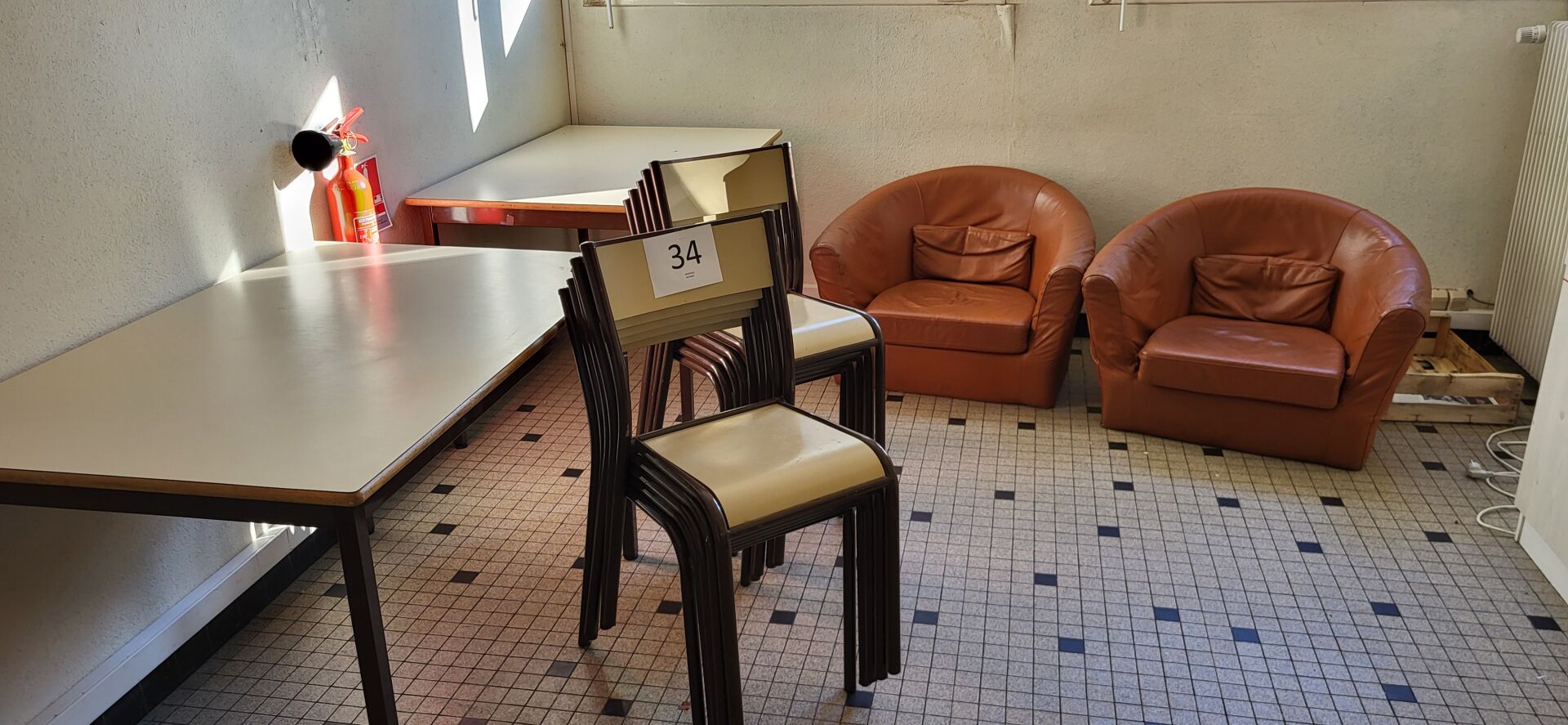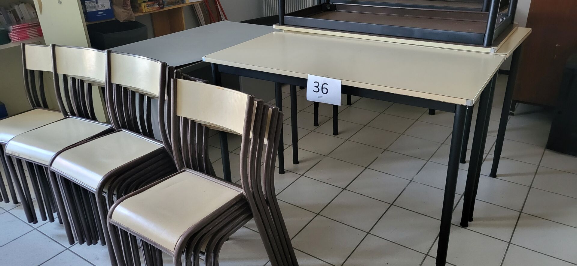 5 tables mélaminé beige piètement métal noir réglable en hauteur, 18 chaises métal marron...