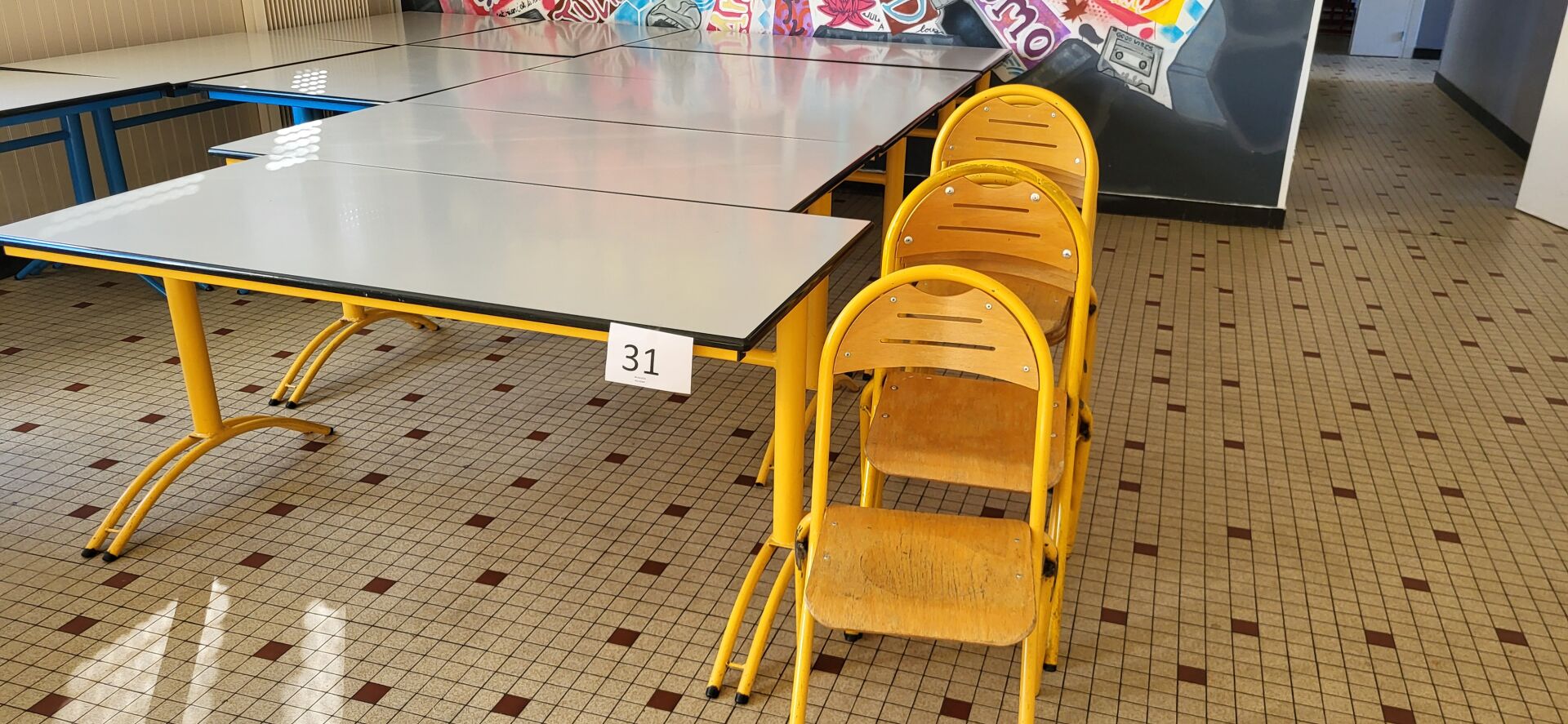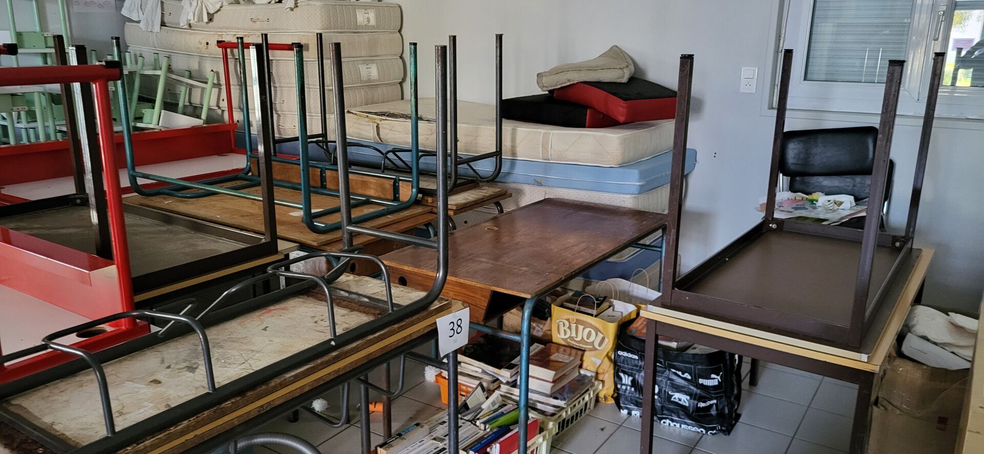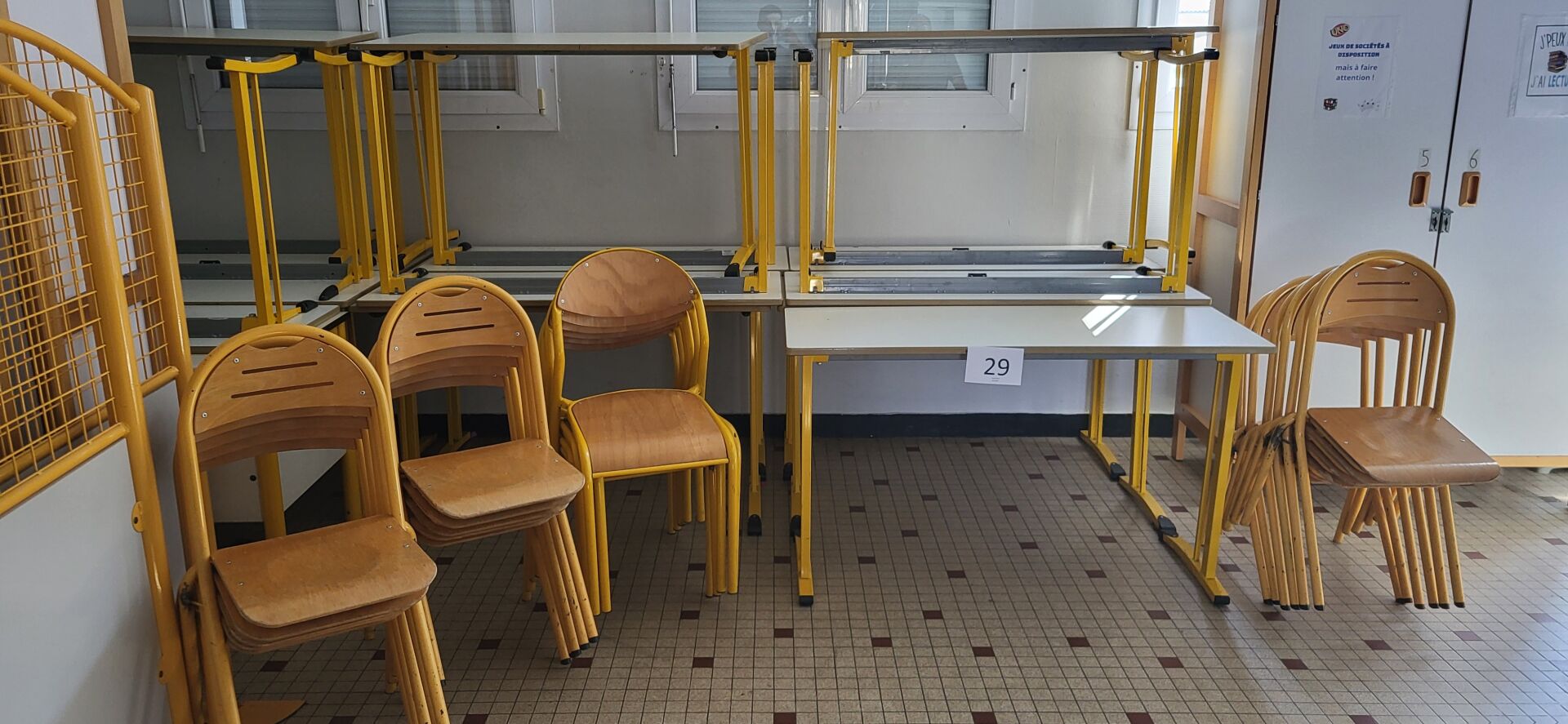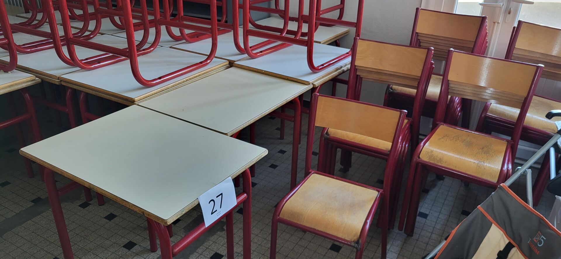 5 tables mélaminé beige piètement métal noir réglable en hauteur, 18 chaises métal marron...