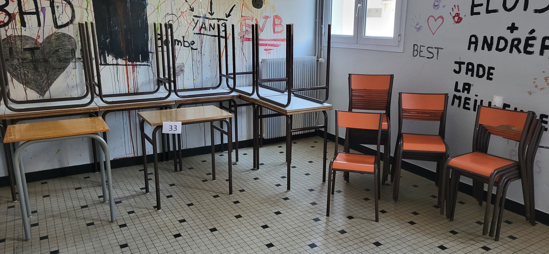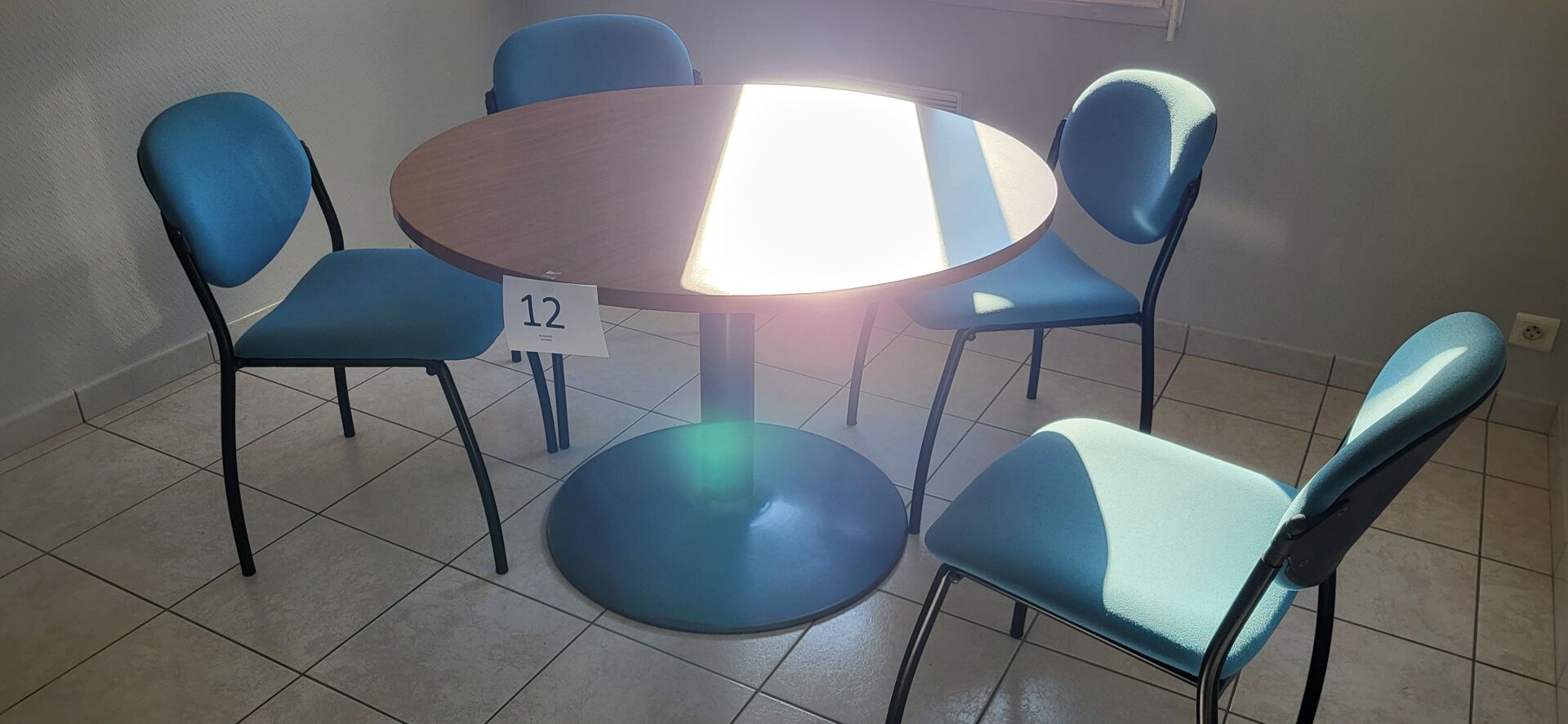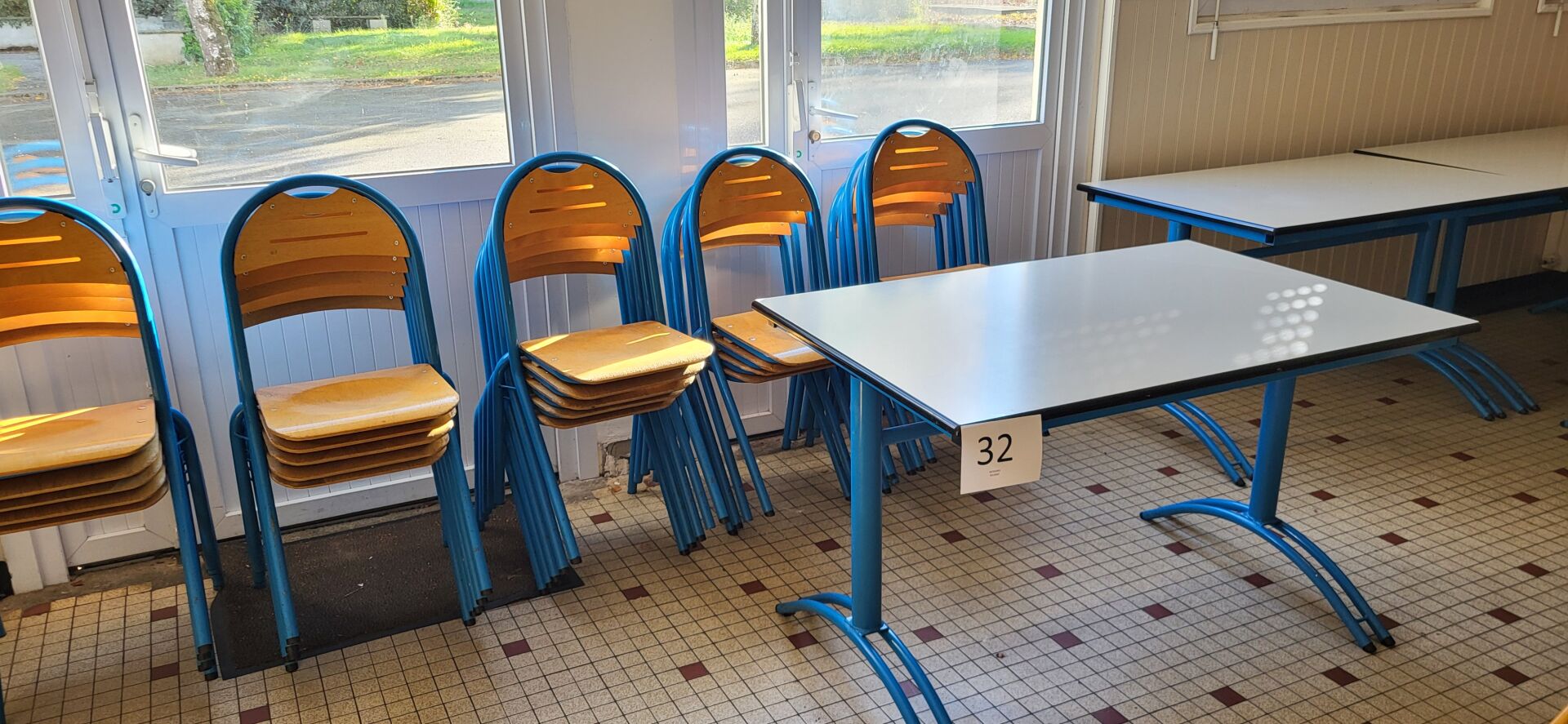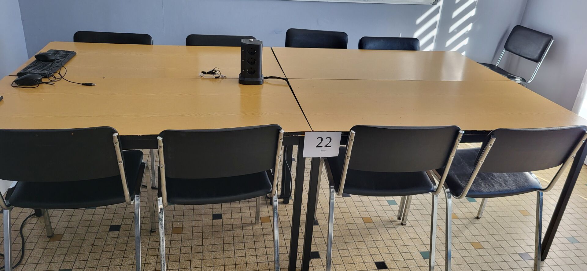 5 tables mélaminé beige piètement métal noir réglable en hauteur, 18 chaises métal marron...