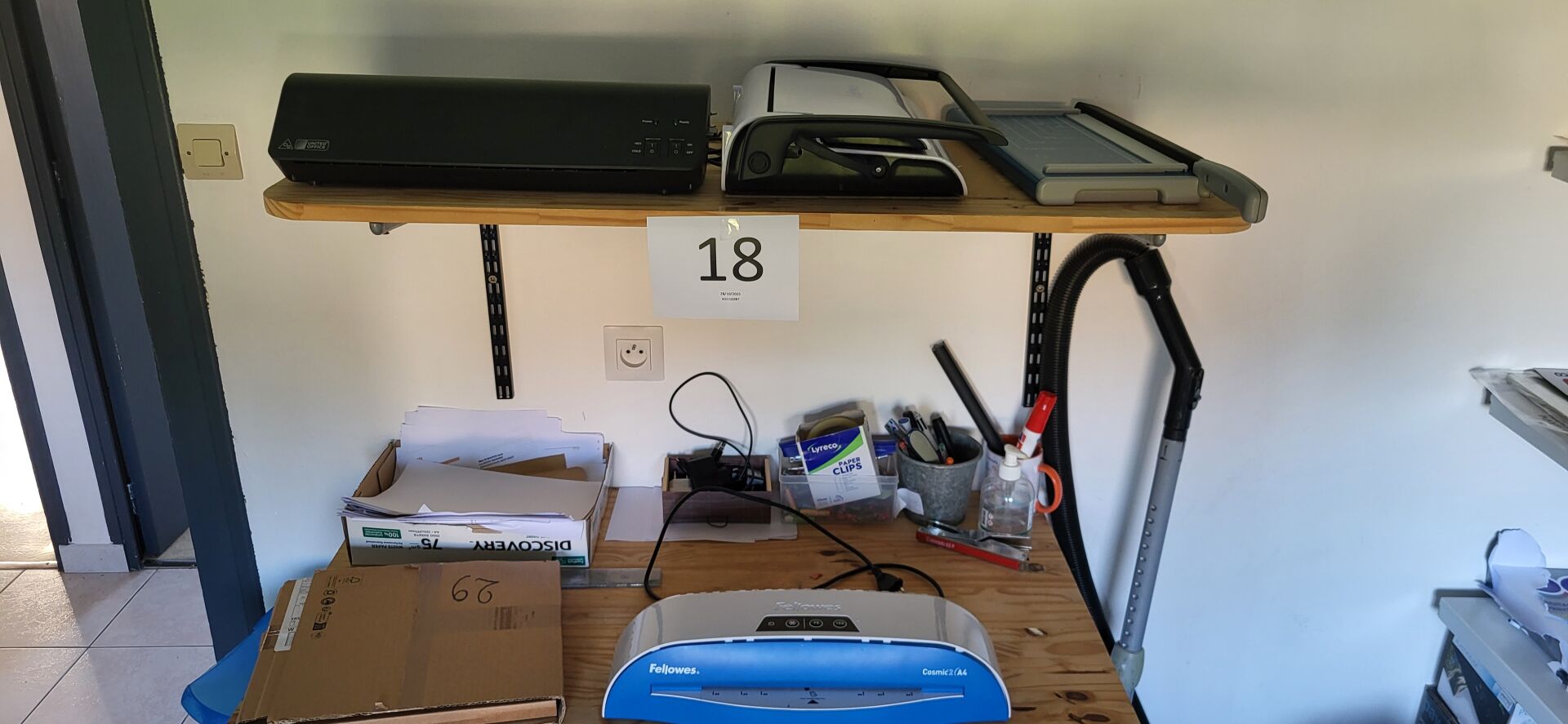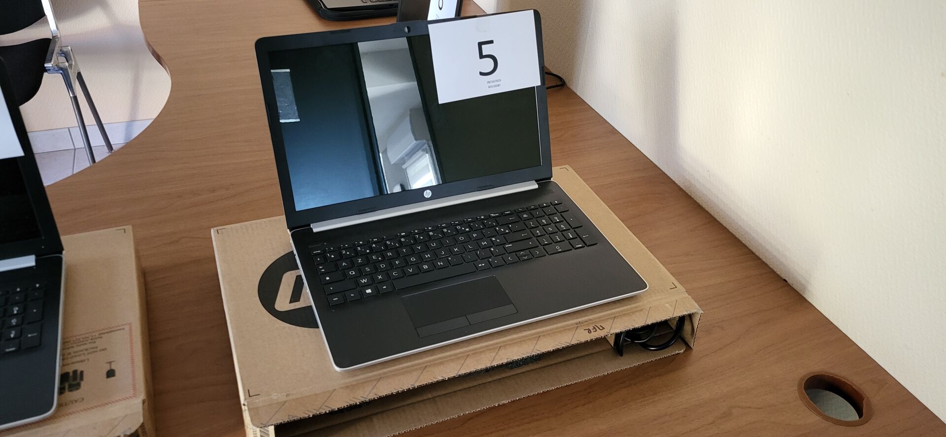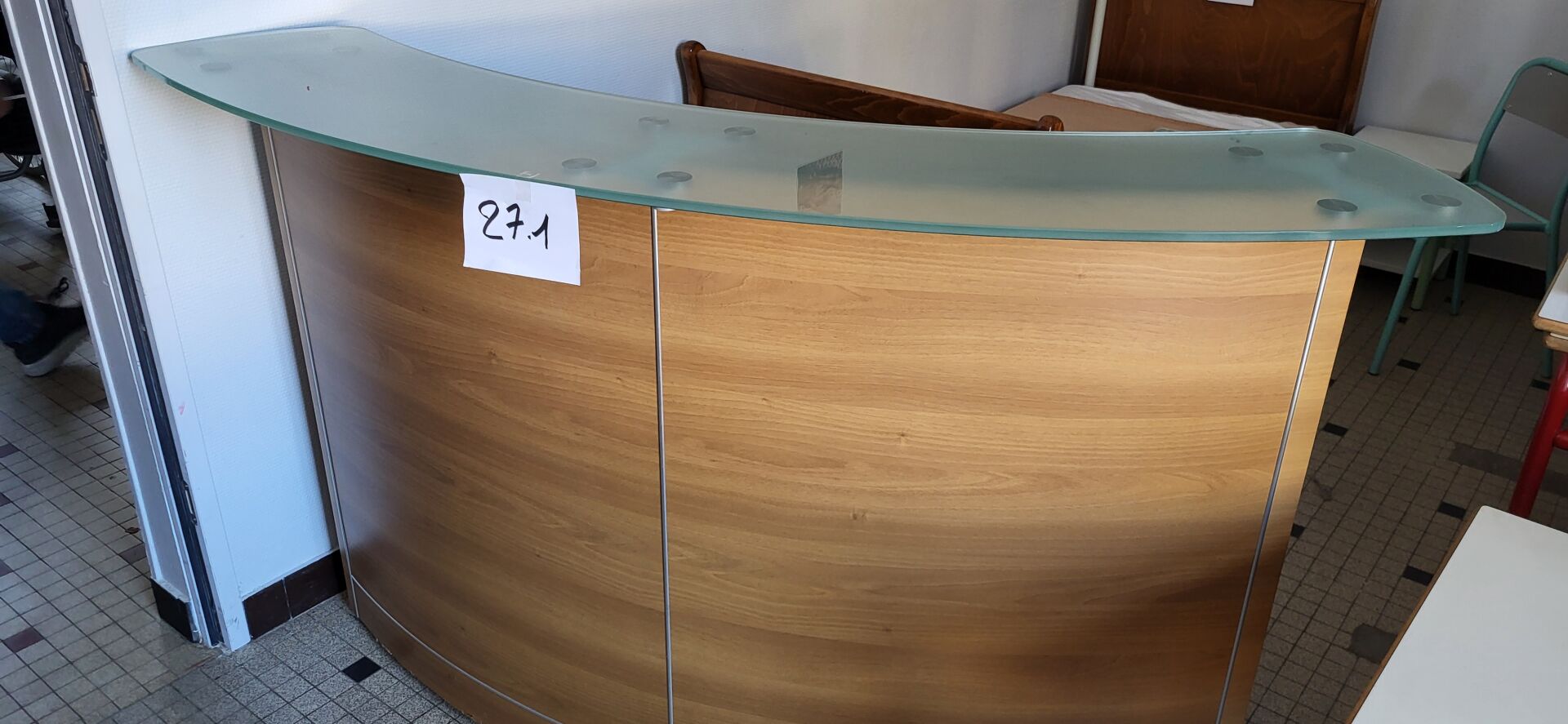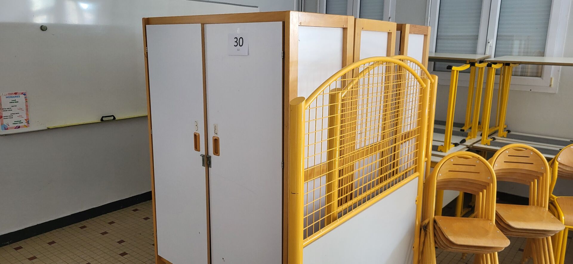 5 tables mélaminé beige piètement métal noir réglable en hauteur, 18 chaises métal marron...