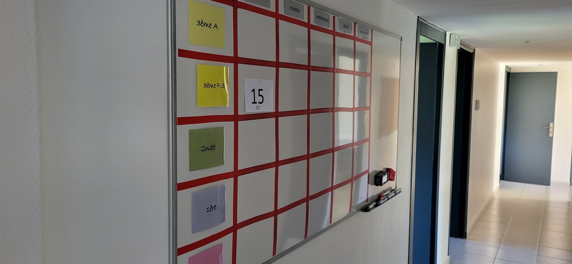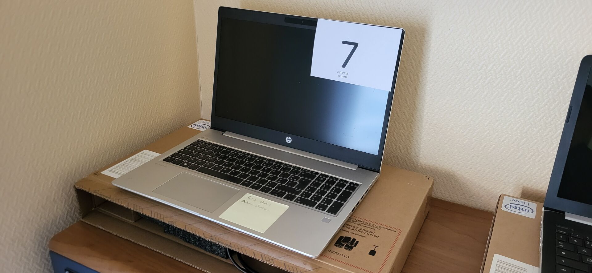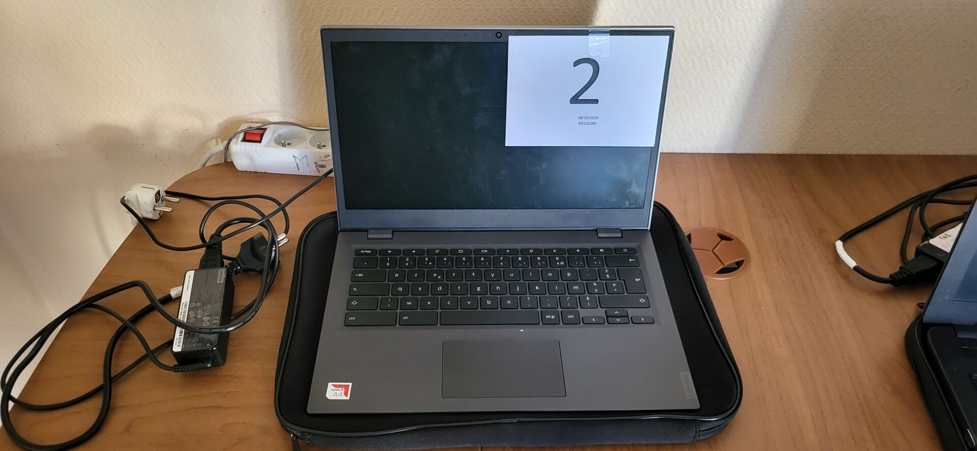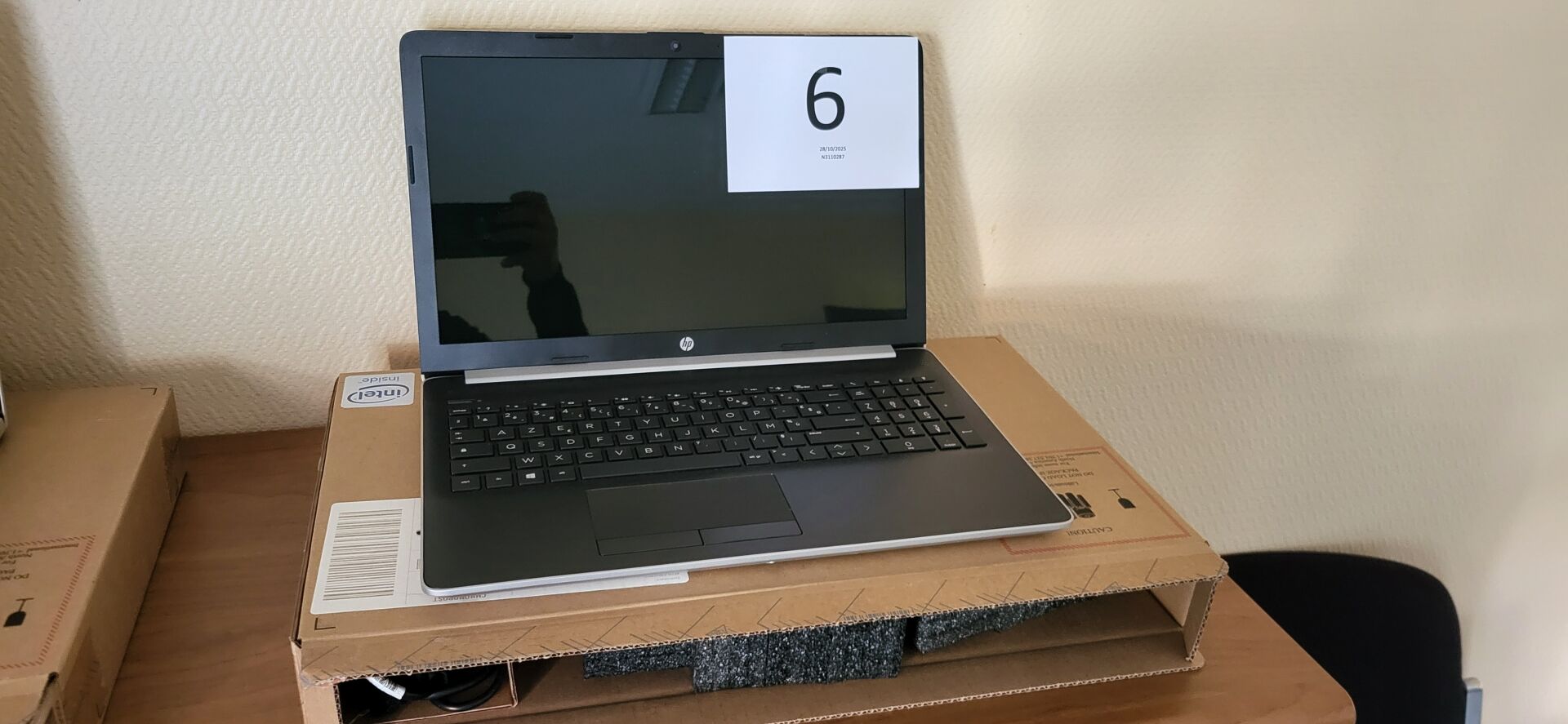 5 tables mélaminé beige piètement métal noir réglable en hauteur, 18 chaises métal marron...