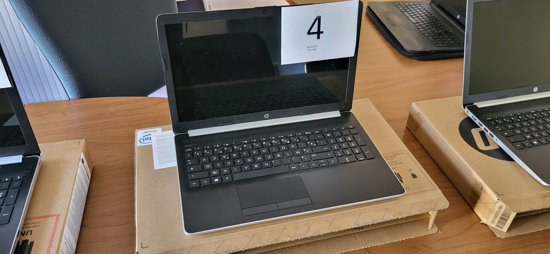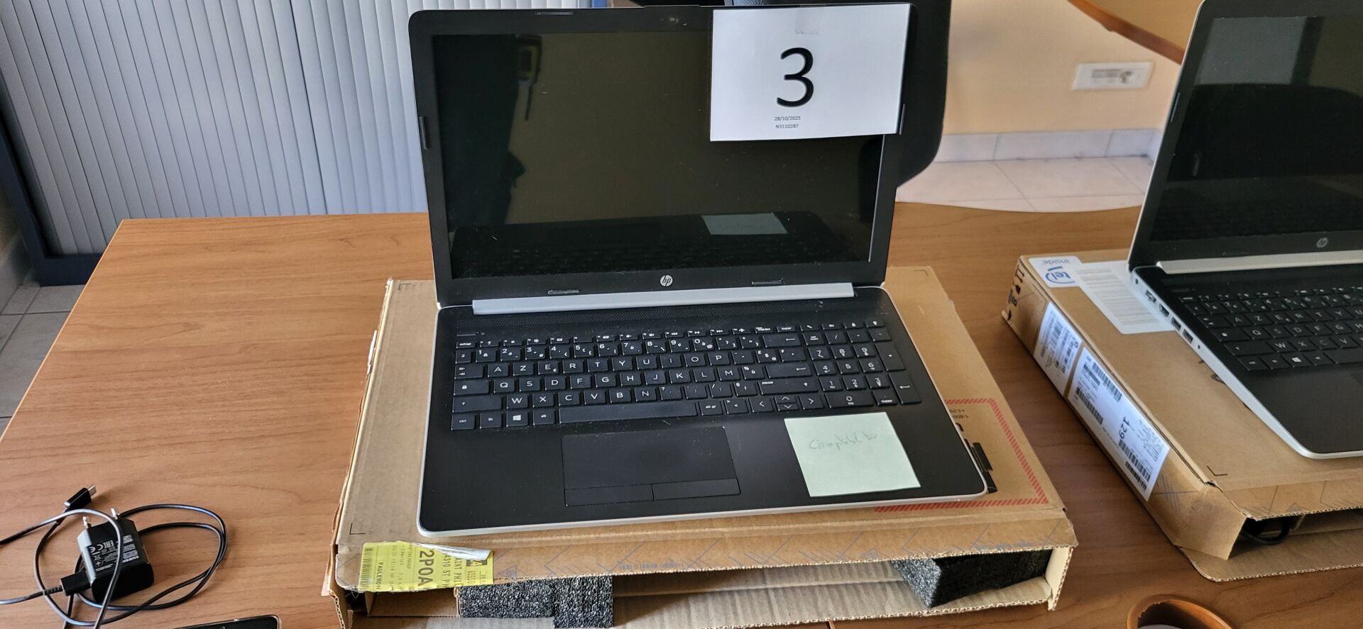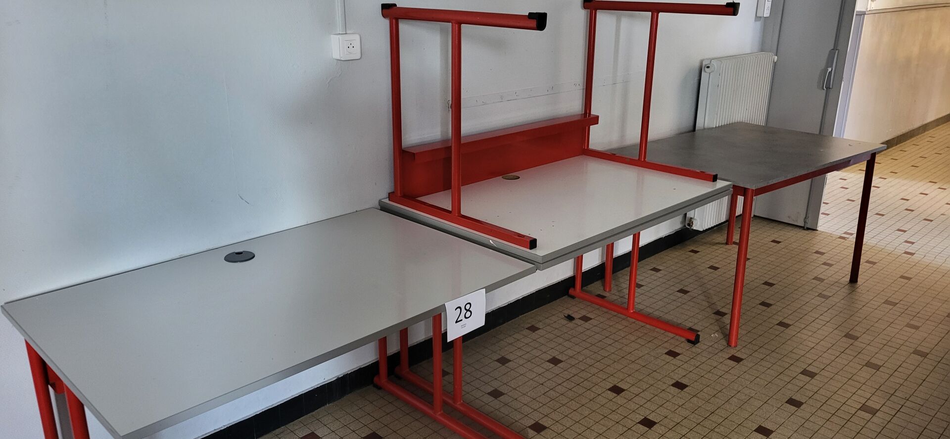 3 tables mélaminé beige piètement métal marron : 2 de 120 x 80 cm, 1 de 120 x 60 cm