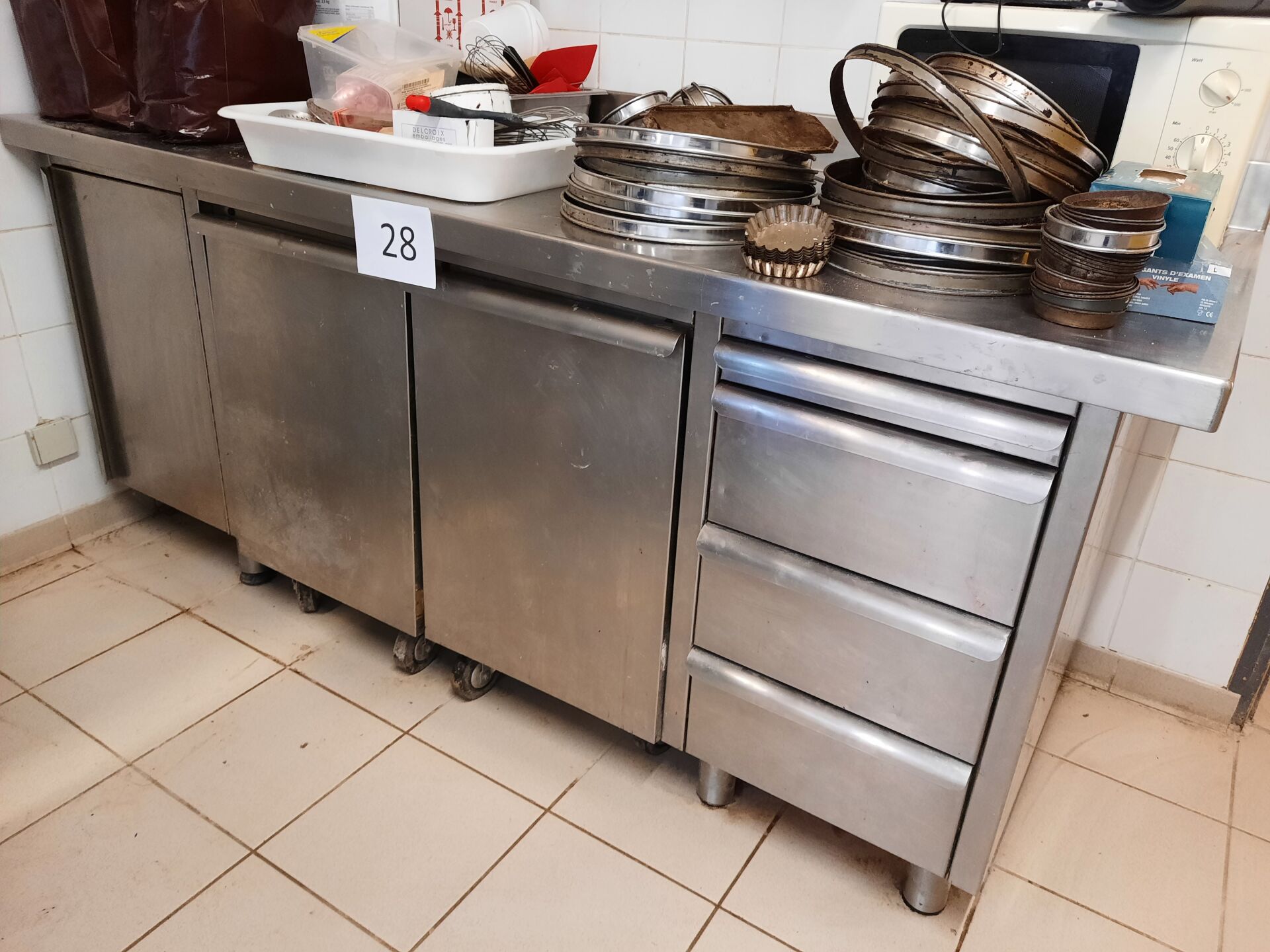 Meuble bas inox à dosseret à 4 tiroirs, 1 vantail et 2 bacs roulants 200 x 80cm