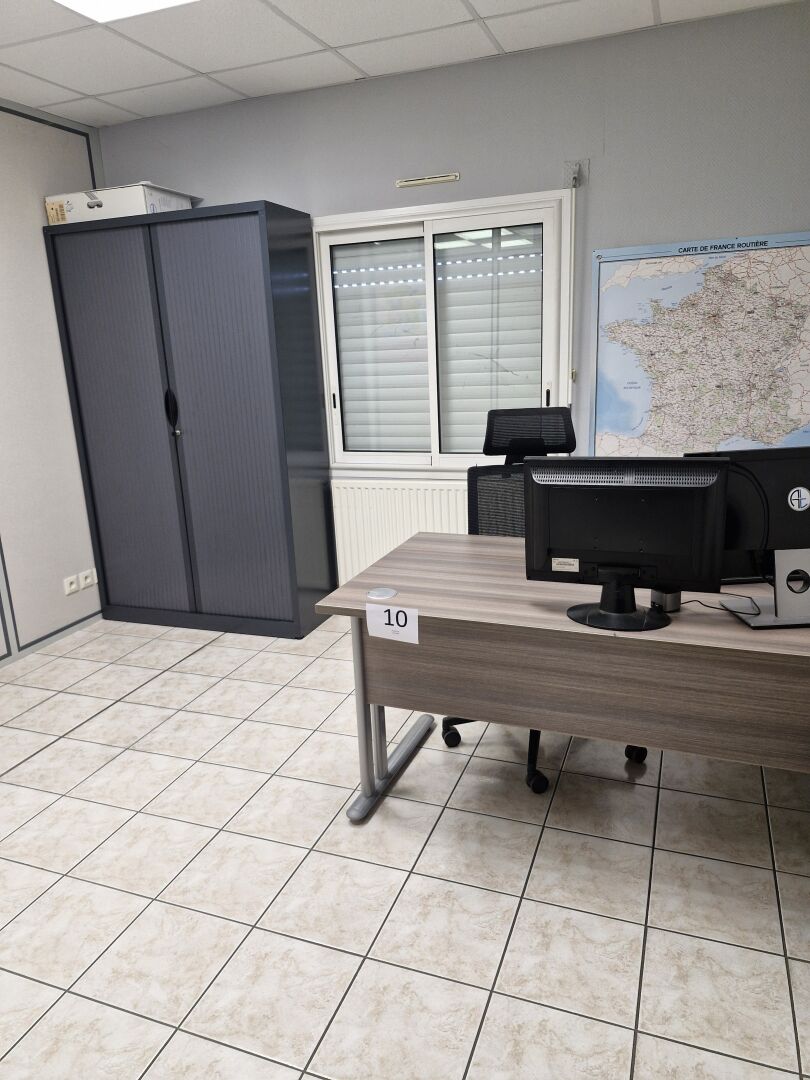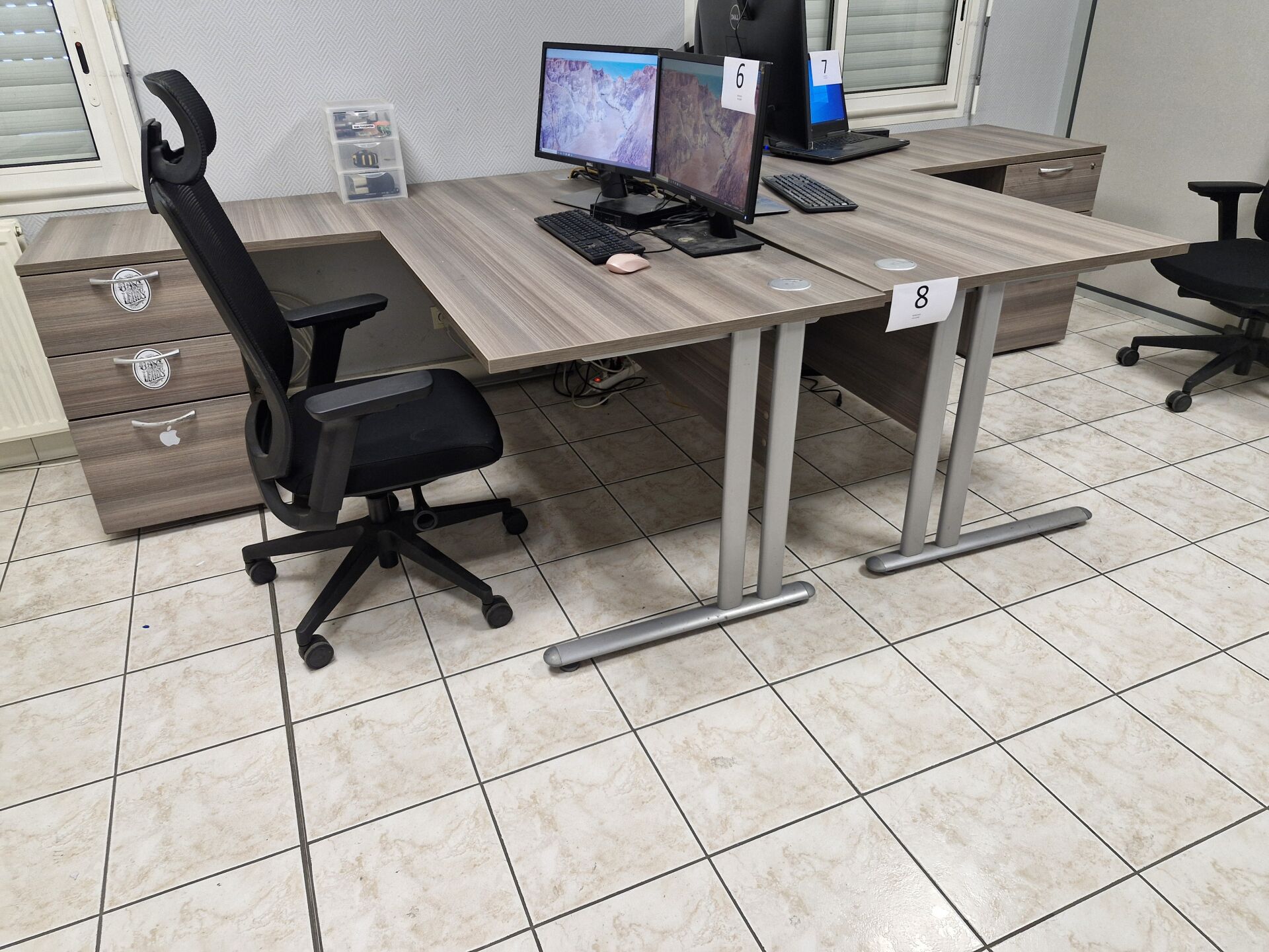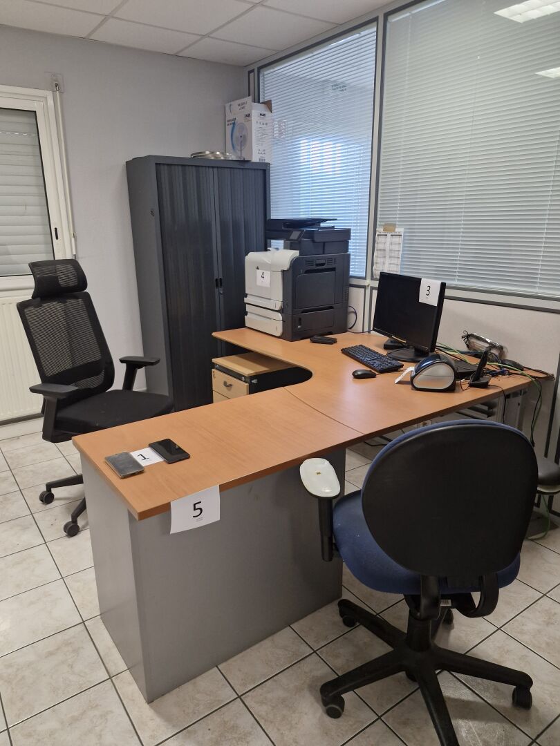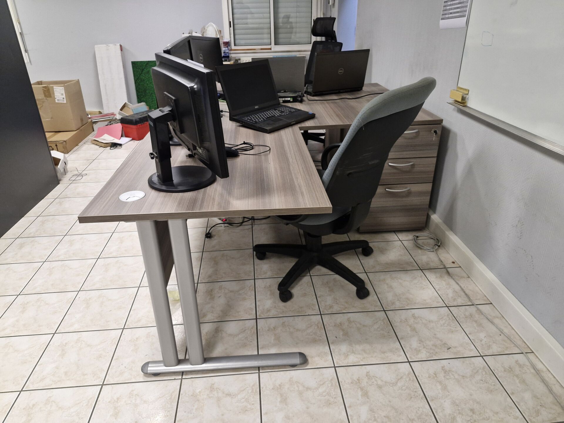 Bureau d’angle en métal et mélaminé bois à retour sur caisson métallique à rideaux...