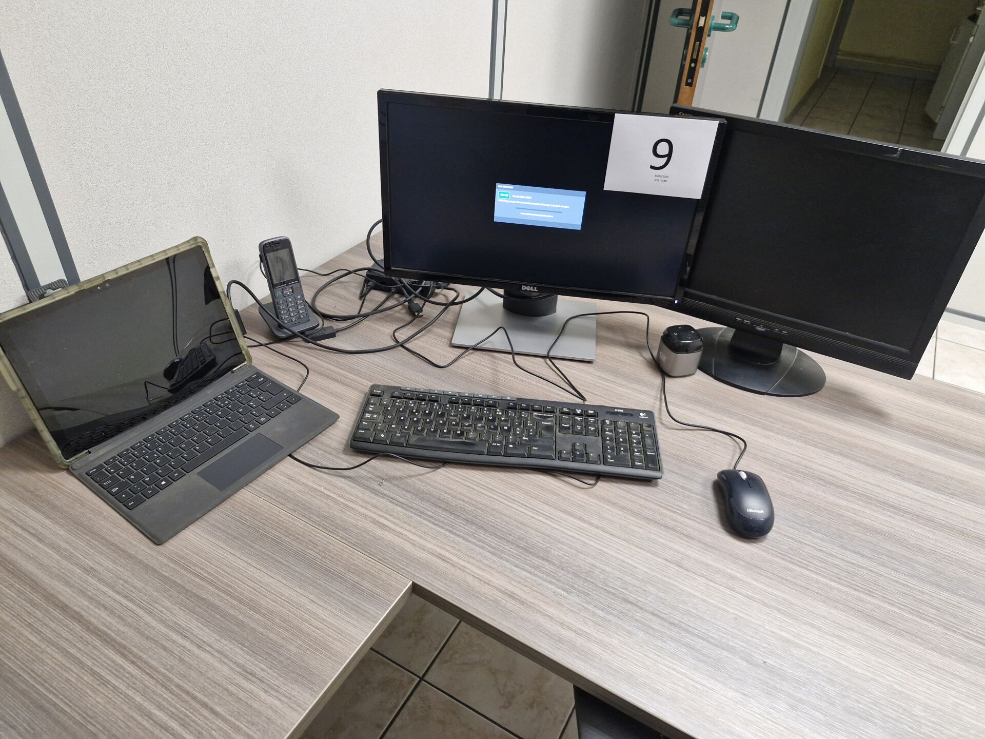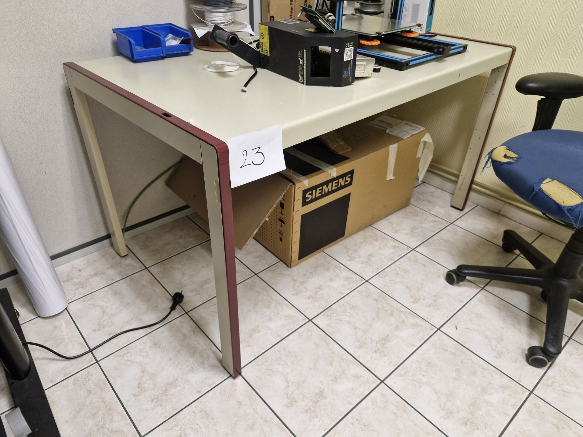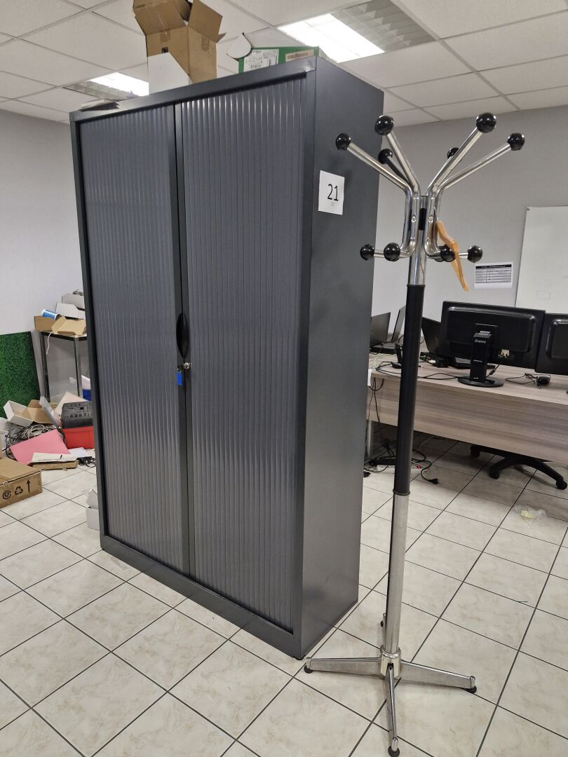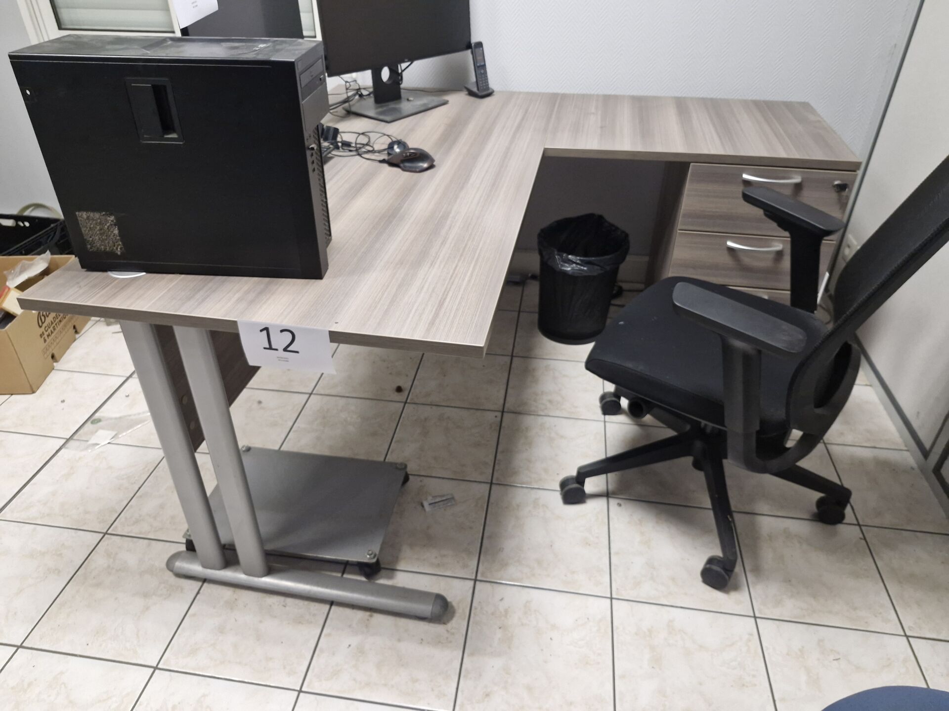 Bureau d’angle en métal et mélaminé bois à retour sur caisson métallique à rideaux...