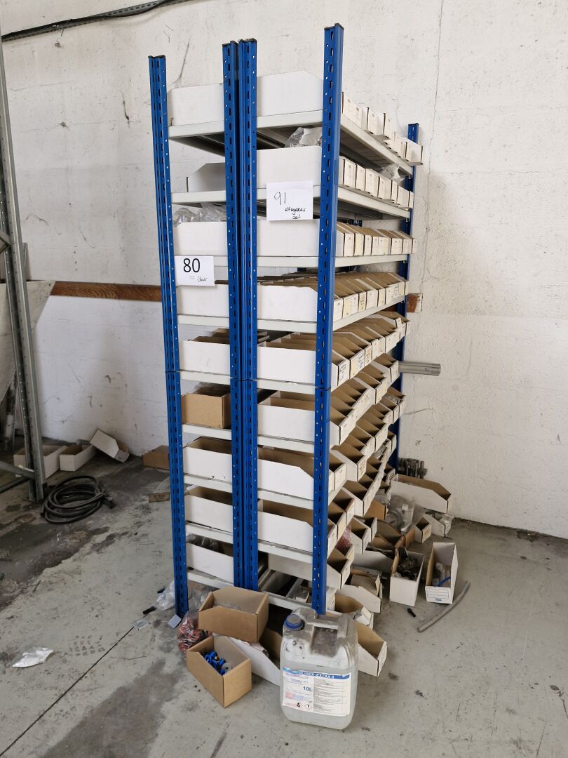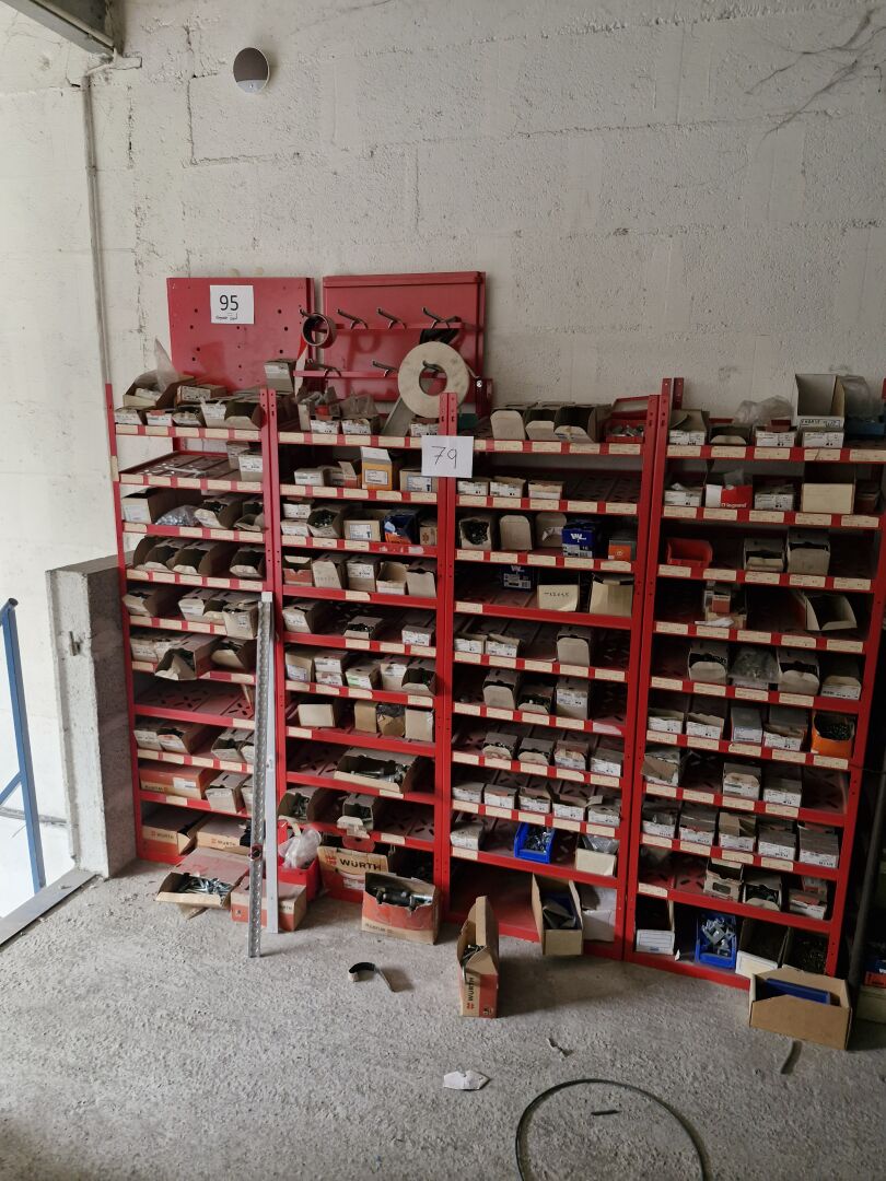 Sur 5 étagères bleues : 1 stock de petite quincaillerie inox dont vis, écrous, rondelles + le...