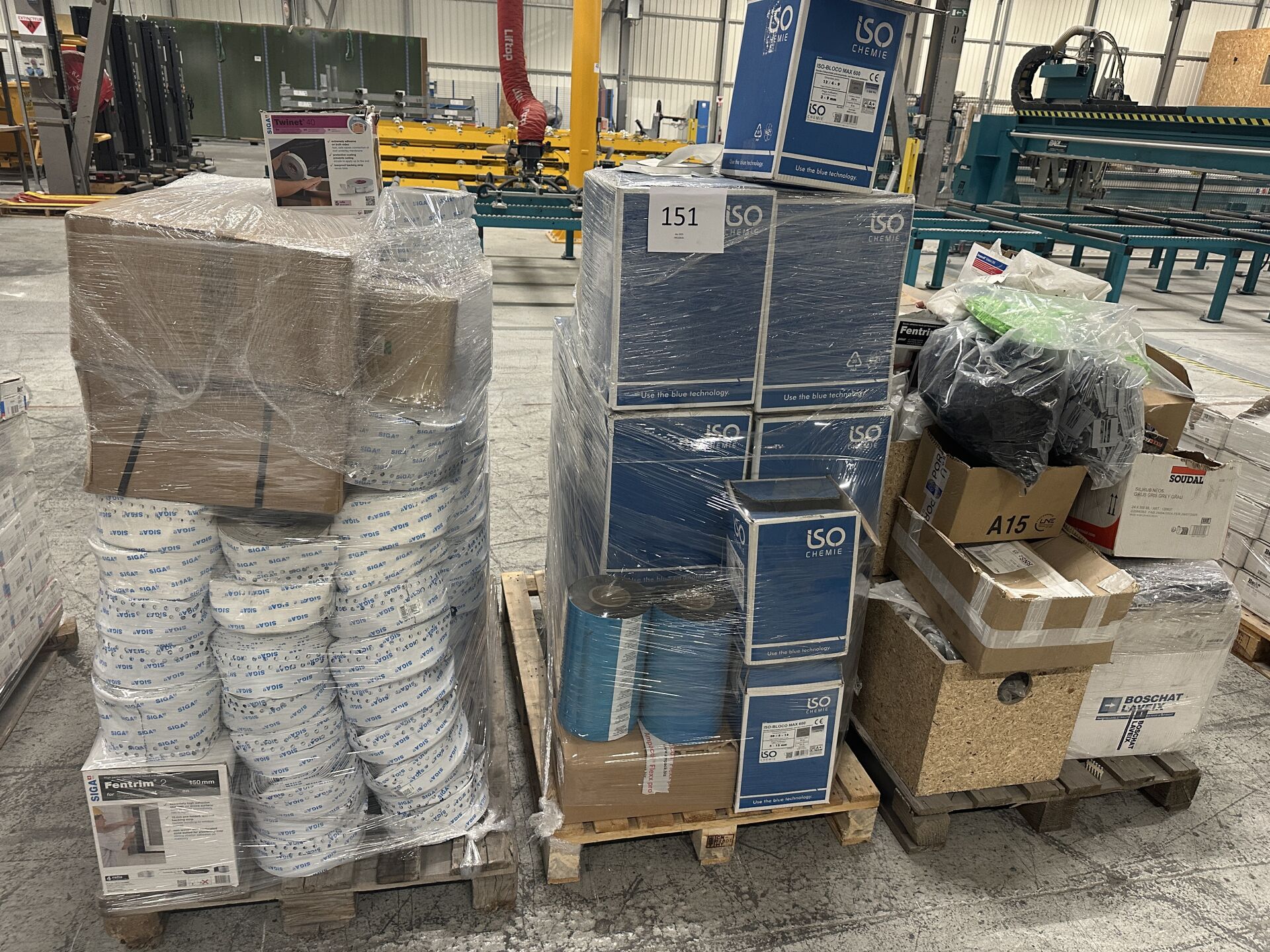 Sur 3 palettes, lot de bandes d’étanchéité dont ISO-BLOCO MAX 600, SIGA TWINET 40,...