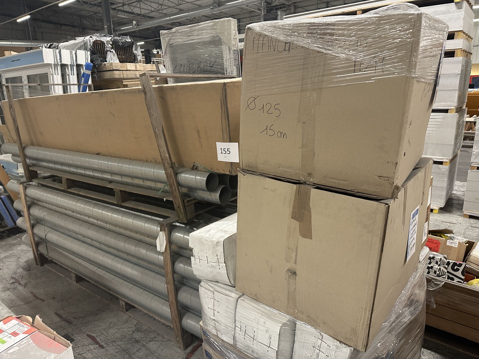 Sur 2 palettes, lot de fumisterie dont tubes galva diam. 120mm en 3m, manchettes 5cm, anneaux...