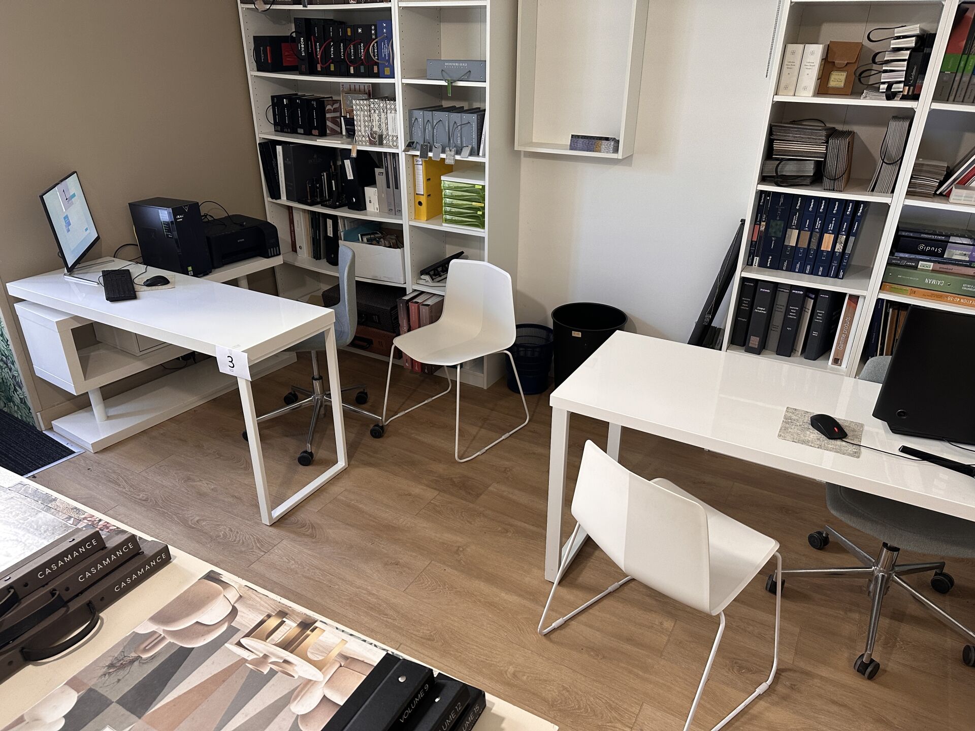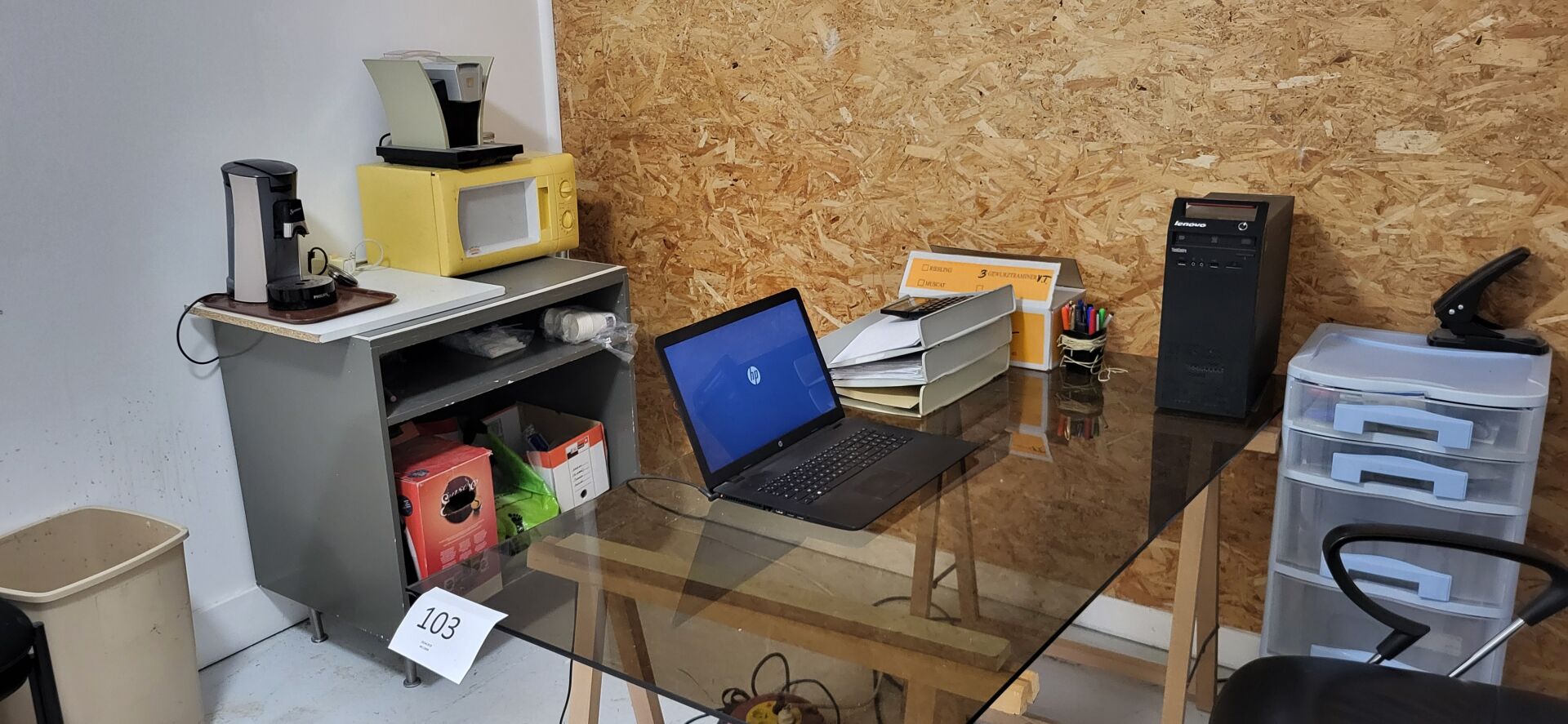 2 bureaux mélaminé blanc dont 1 avec retour (140 x 48 cm et 140 x 60 cm) , 2 chaises...