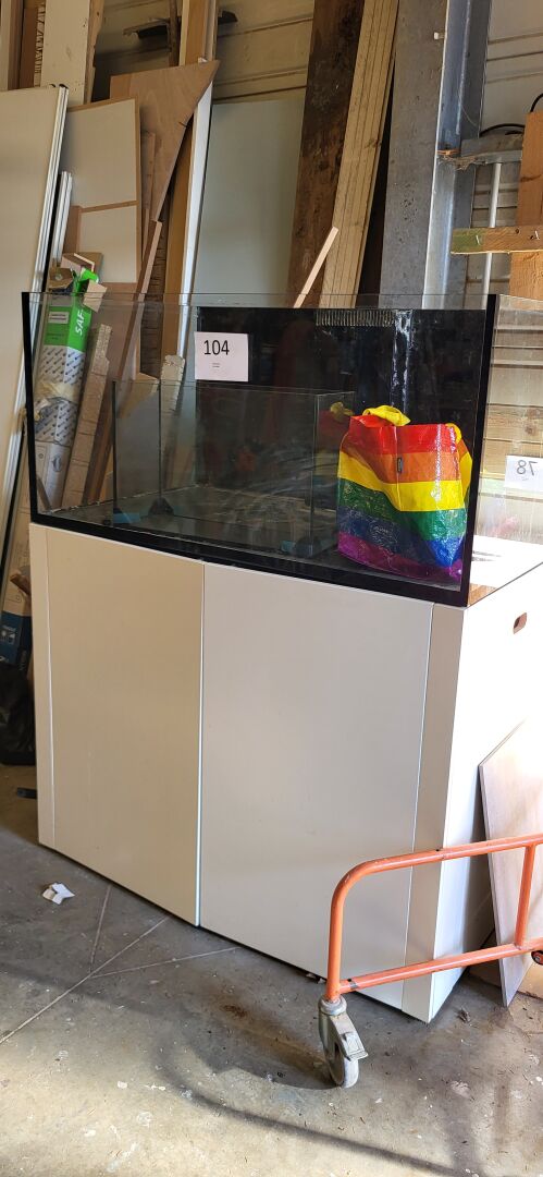 1 aquarium 700L, sur meuble mélaminé blanc130 x 75 x 160 cm (vidé)
